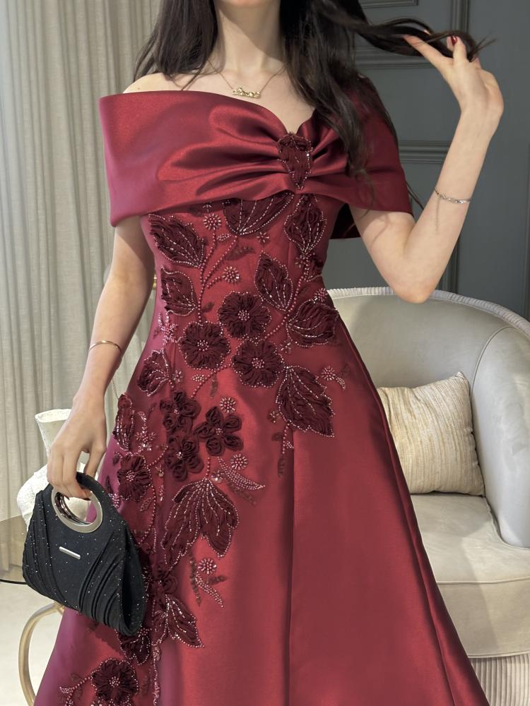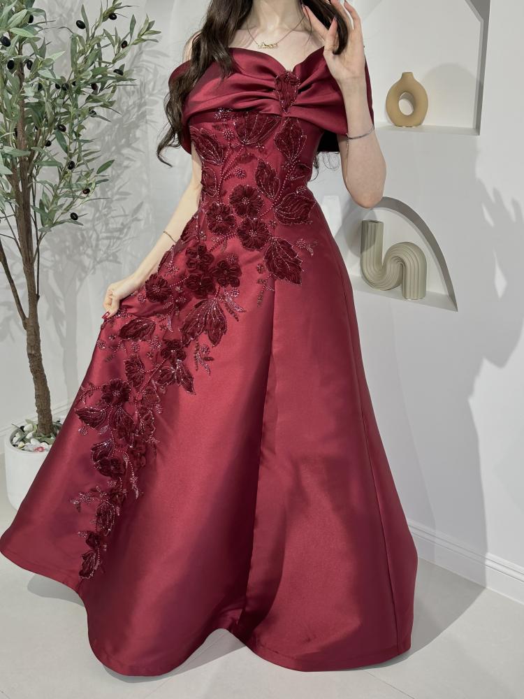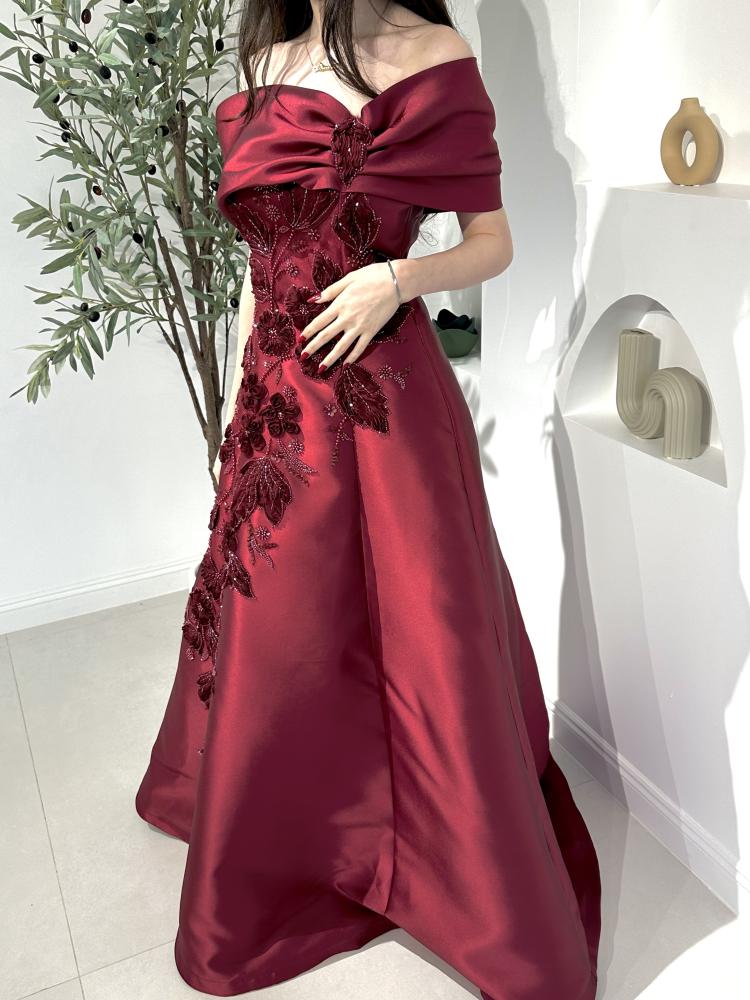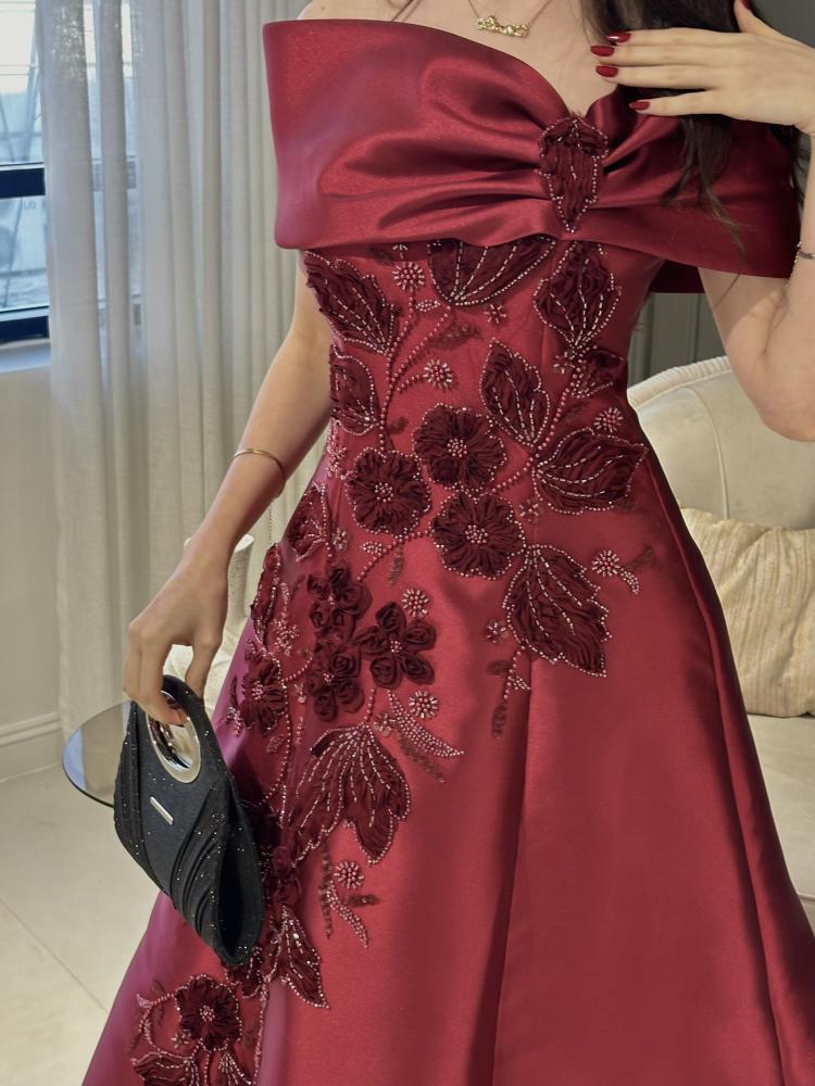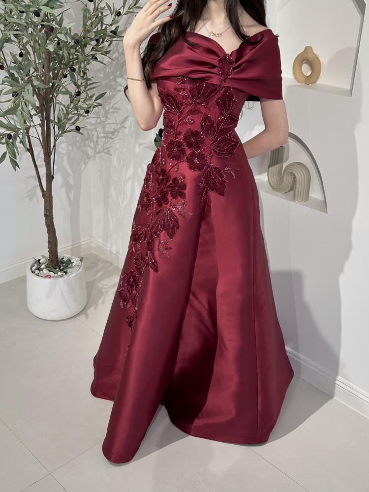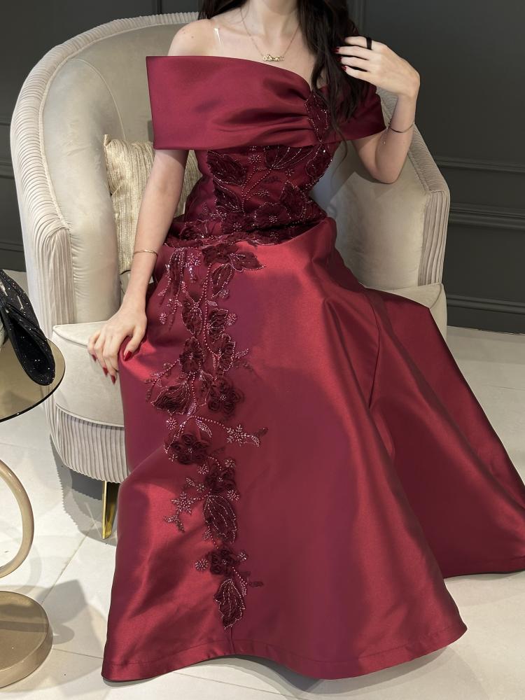 فستان بلون البرغندي بخام الميكادو مزين بكلفه مورده على تطريز خرز صغير متوفر بخمسة مقاسات من S الى XXL