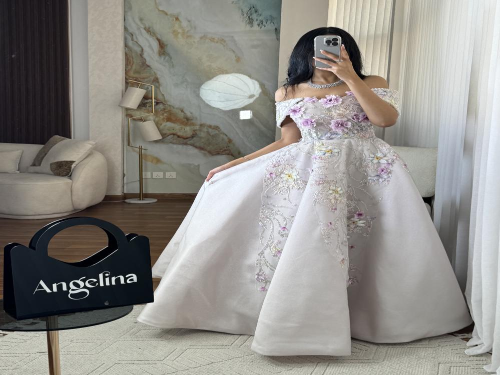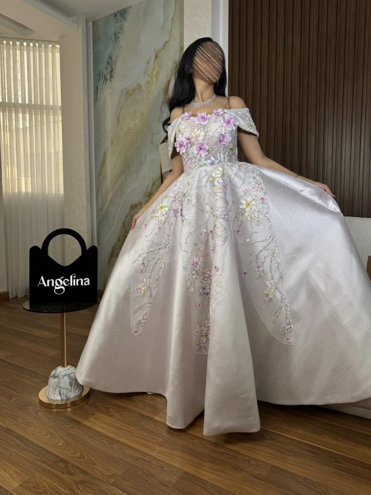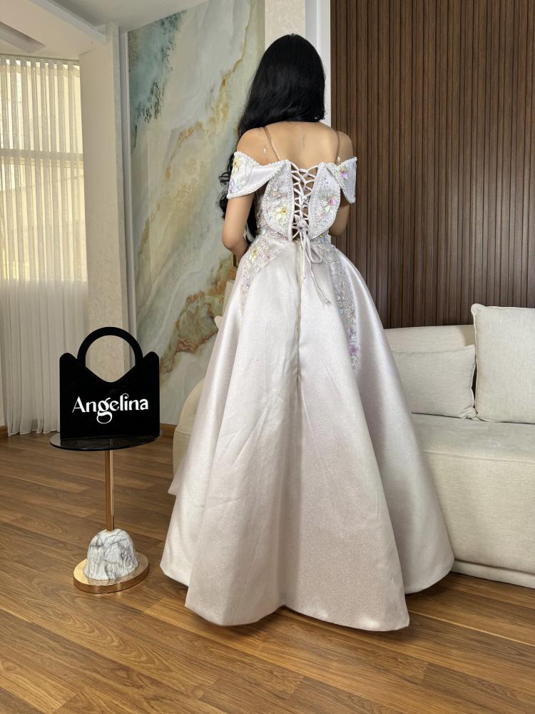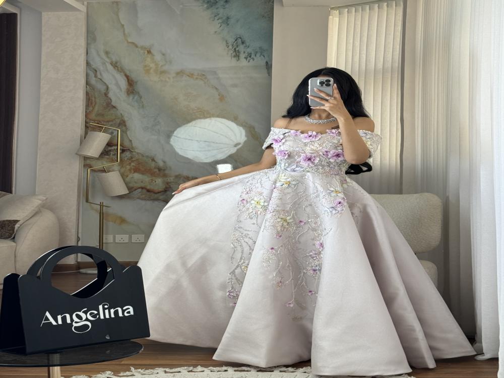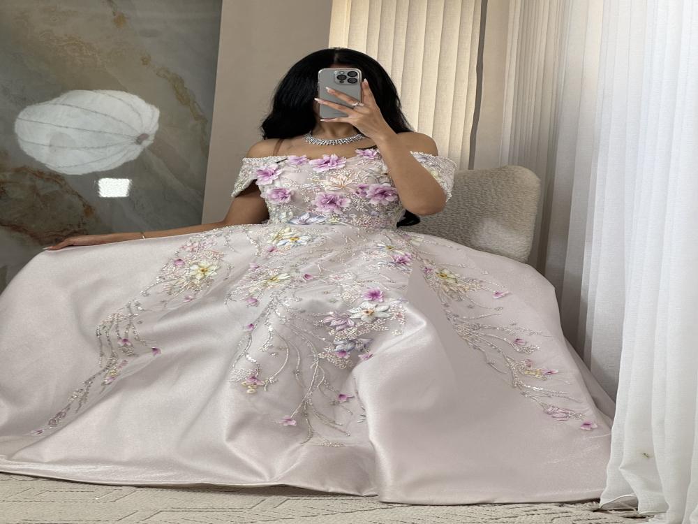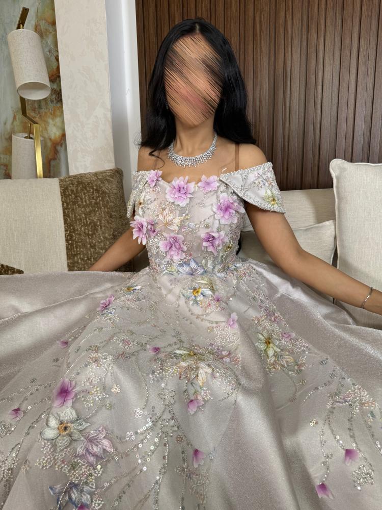 فستان بلون البيج بخام الميكادو اللمعه مزين بتطريز كلفه بخمسة مقاسات من S الى XXL