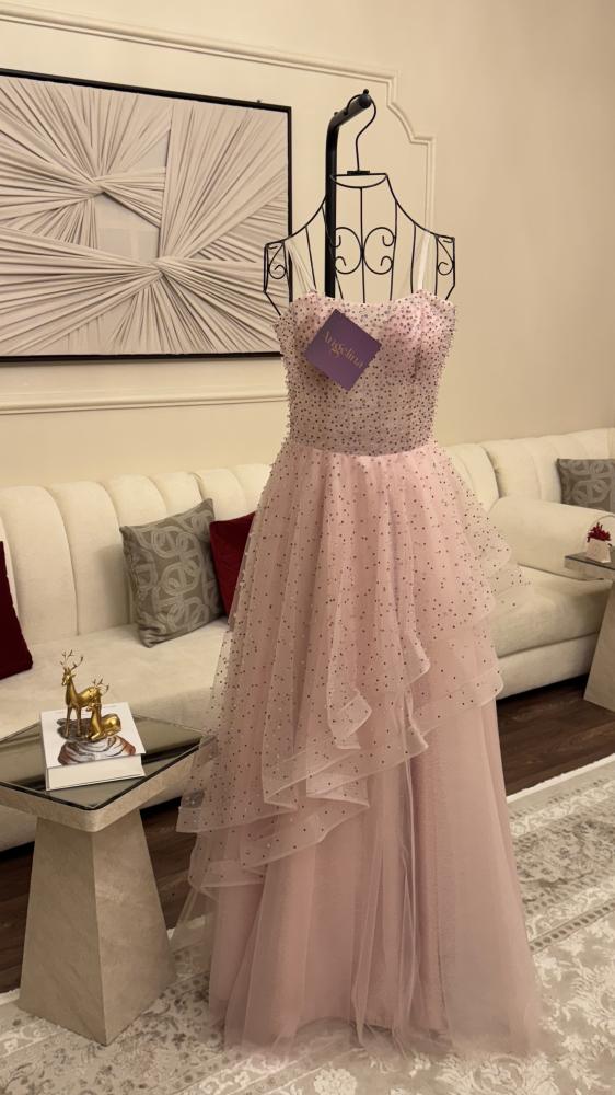 فستان طويل لون لحمي بقماش التل مضافه اليه فصوص وحبات الولو من نفس اللون وتحتيه مبطنه بقماش التفتة