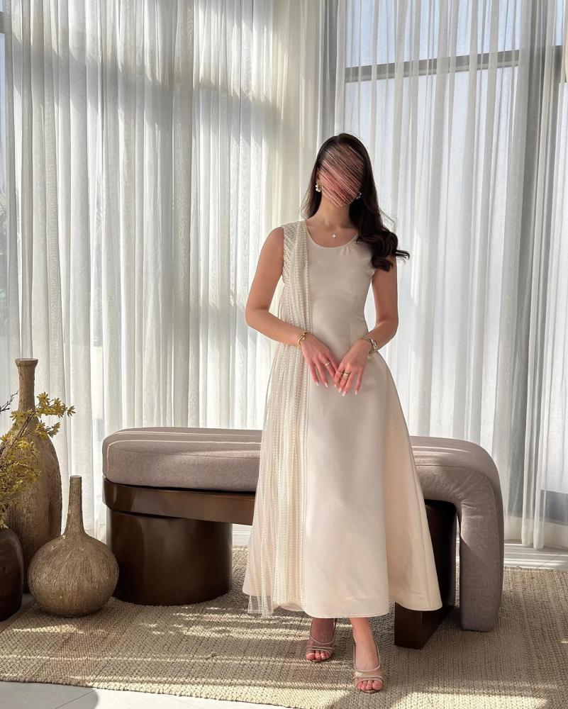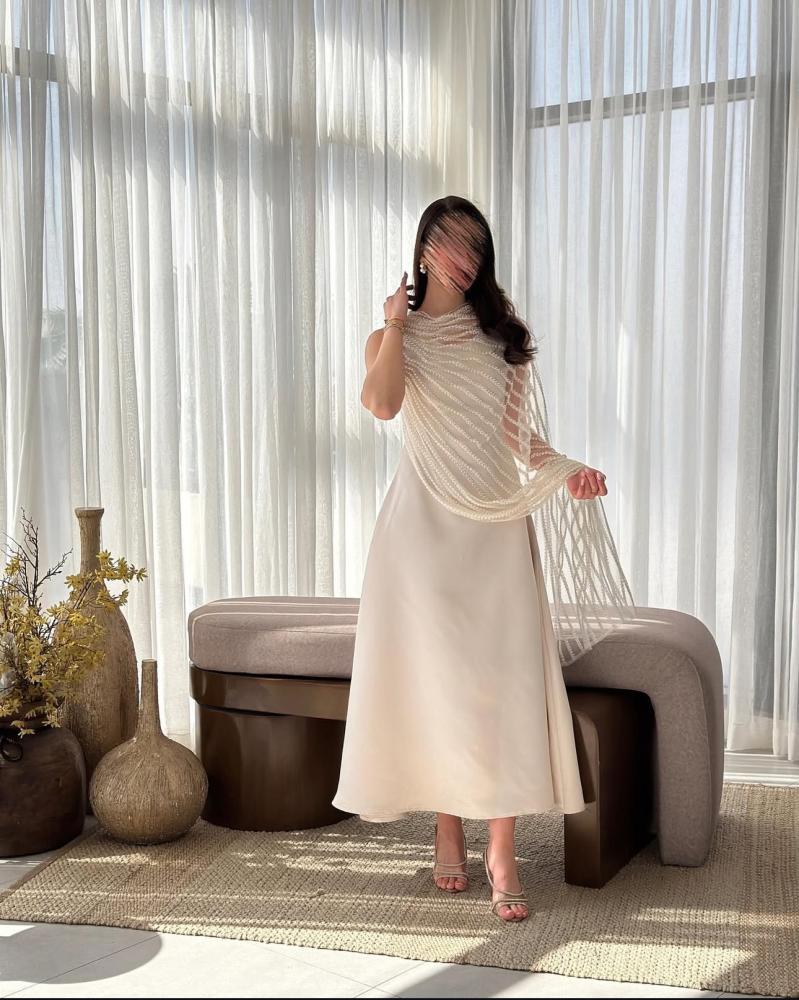 فستان قصير سهرة ناعم بقماش تل مطرز يدوي وتفتة