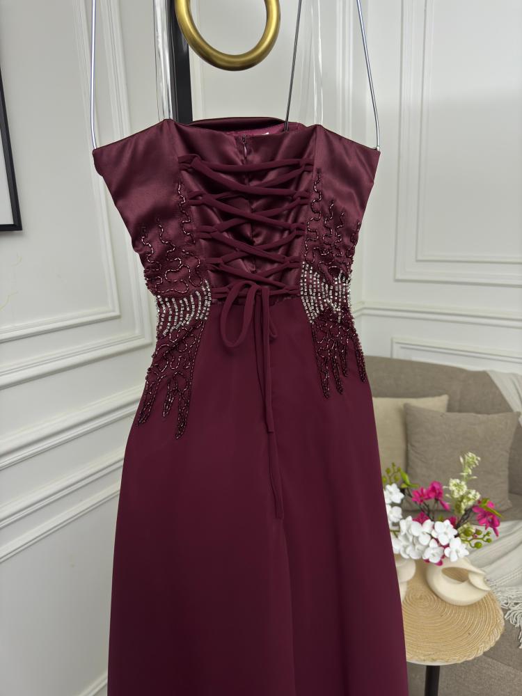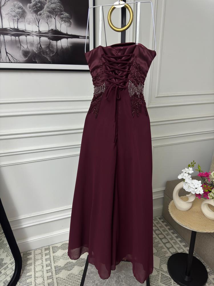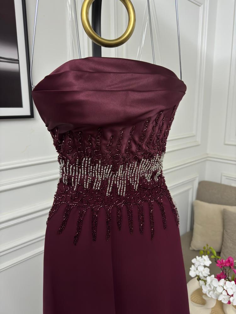 فستان تب طويل لون عودي وقماش تفتة وشيفون وتطريز خرز يدوي