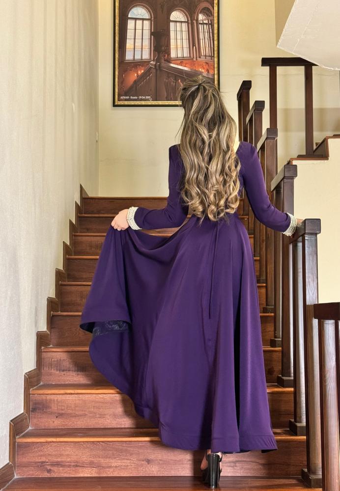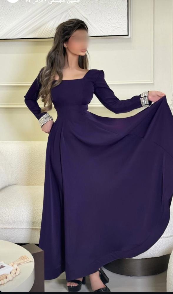 فستان طويل لون بنفسجي ب اكمام طويله مزينه ب اكسسوار خرز نهاية الكم بقماش التفتة الباربي