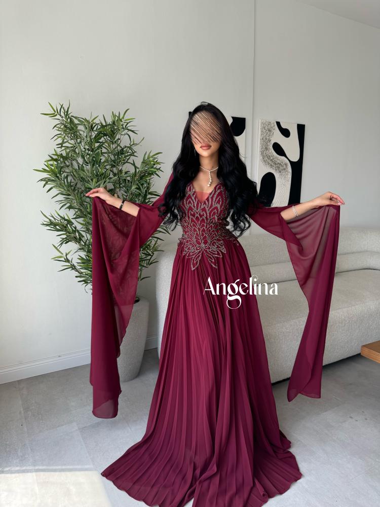 فستان طويل ناعم سهره لون عودي بقماش سهرة عند الصدر بفصوص وتطريز كمبيوتر وقماشه شيفون باكمام طويله