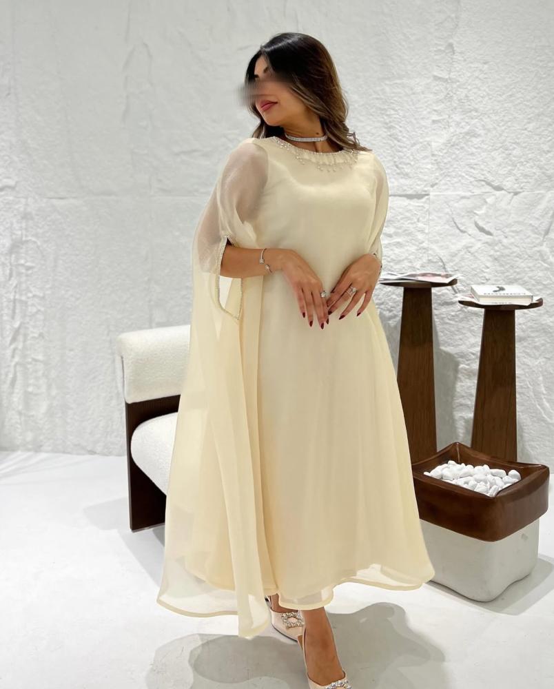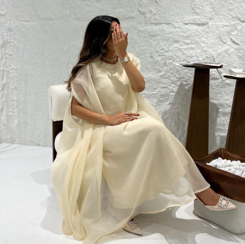 جلابيه بيج ناعمه واسعه مزينه ب اكسسوار عند الرقبه ومخرج اليدين بقماش الجازار وباطنه منفصله