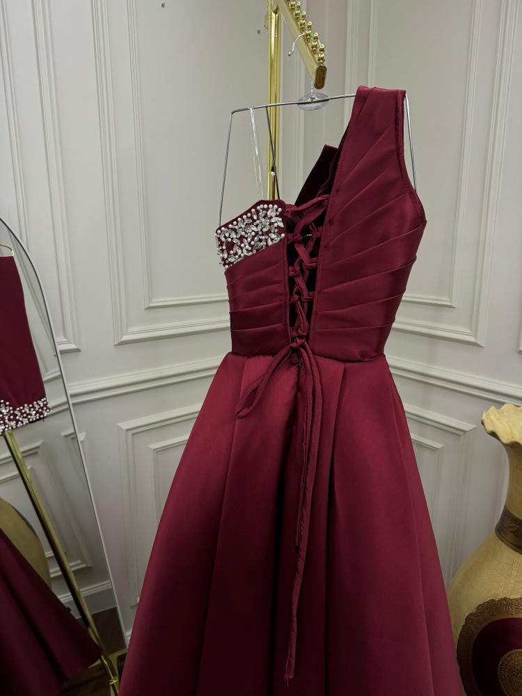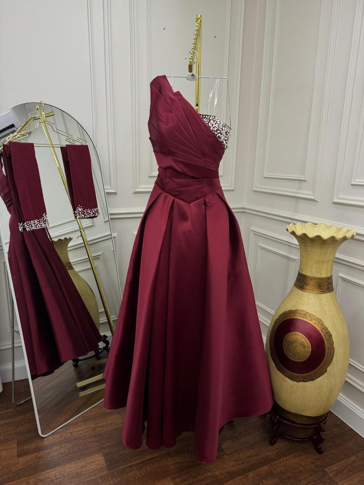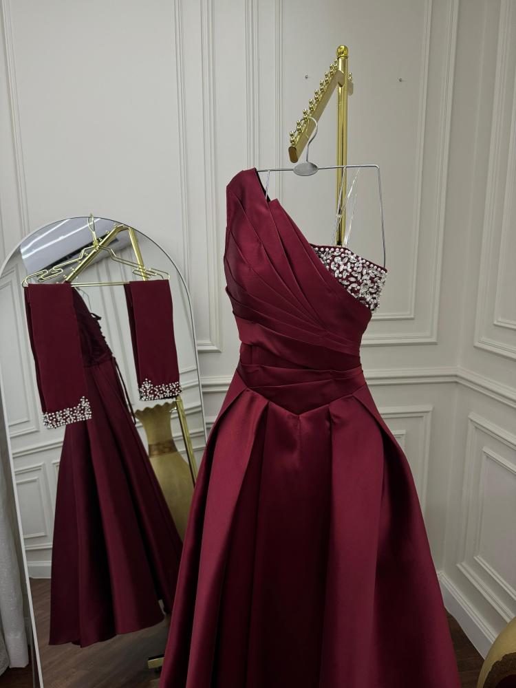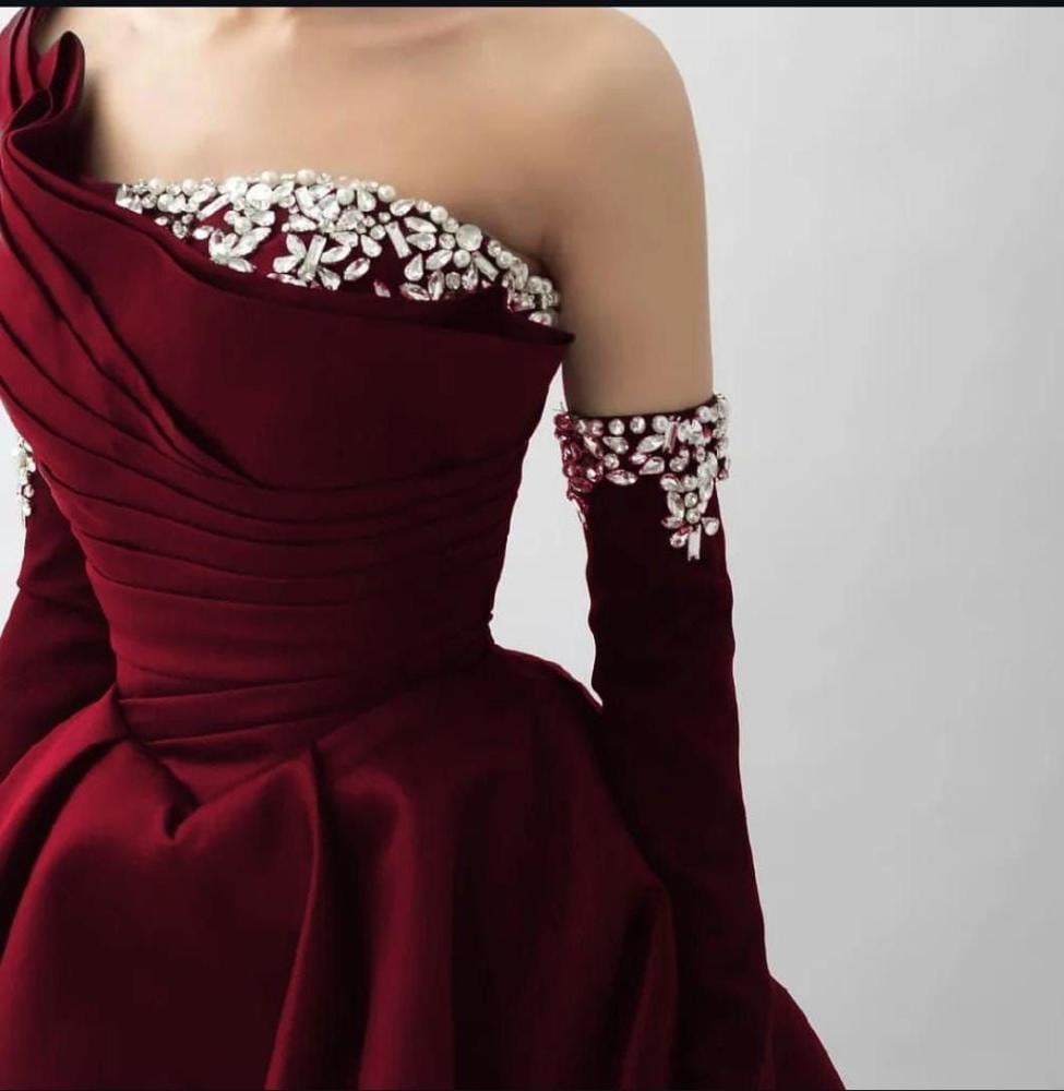 فستان طويل سهرة راقي تطريز كرستال يدوي لون عموي وبقماش التفتة الميكادو واكمام منفصله مطرزه