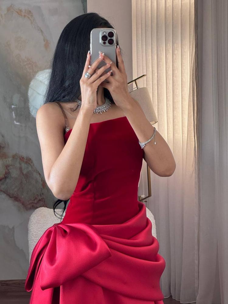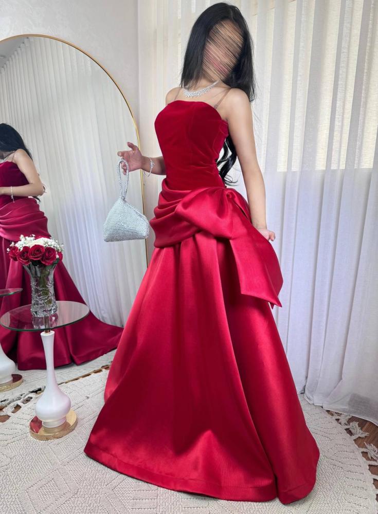 فستان تب سهرة راقي بقماش المخمل الجوخ والتفتة المي كادو واللون الاحمر الداكن