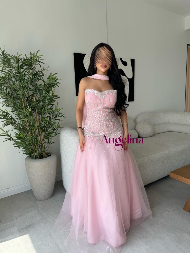 فستان تب طويل سهرة لون لحمي كلفه تطريز بقماش التل الناعم مبطن بقماش التفتة كلووش وبشال منفصل