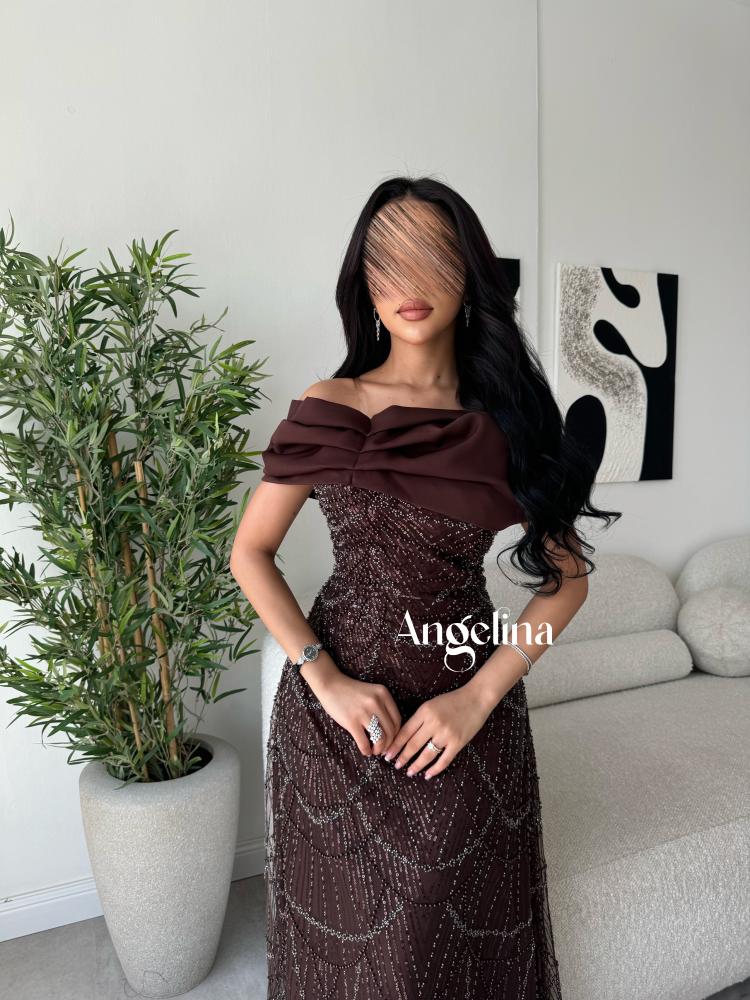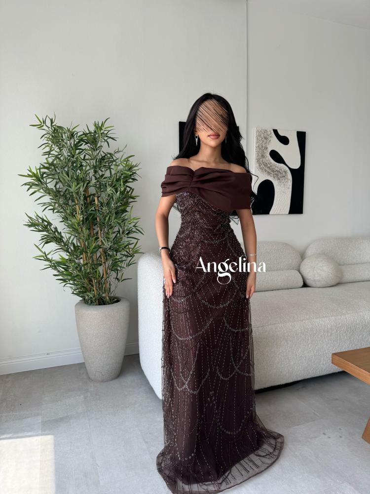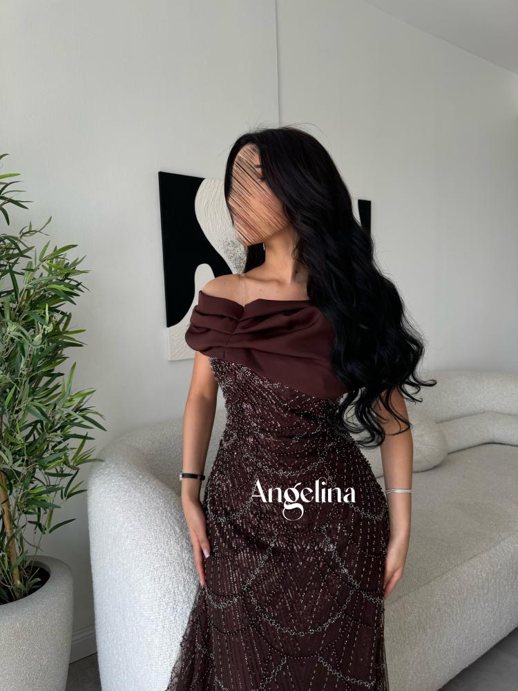 فستان طويل سهرة لون بني ( موكا ) بقماش تل خرز وترتر مبطن بقماش تفتة