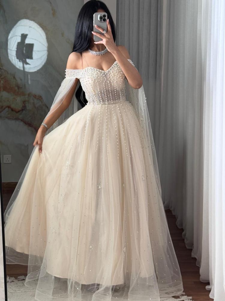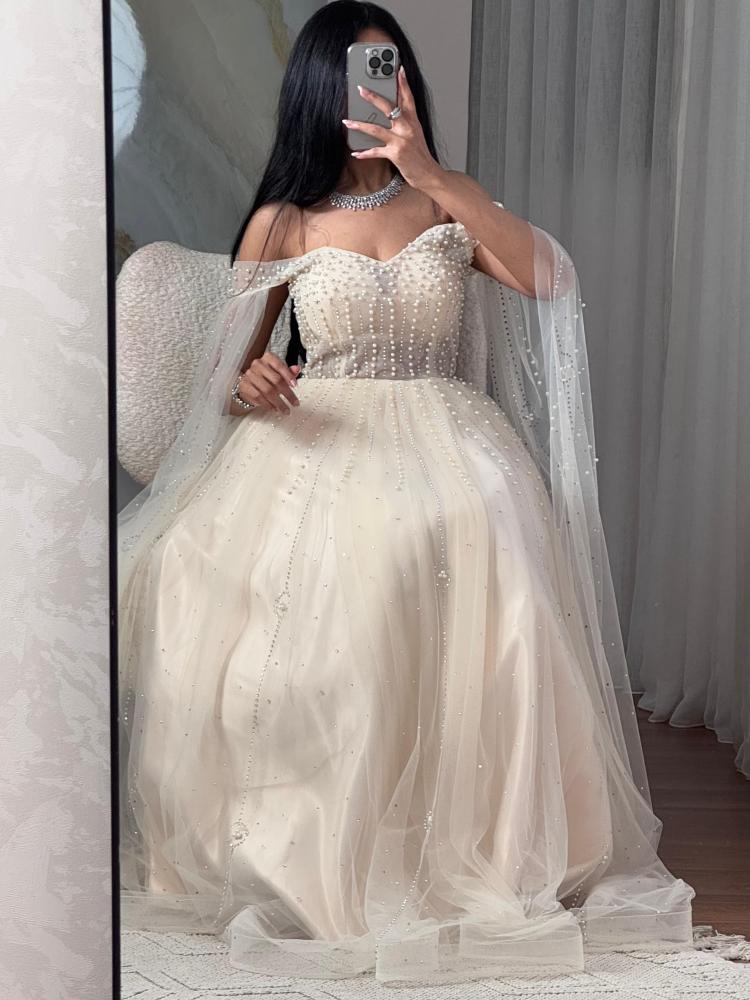 فستان سهرة طويل راقي لون بيج وقماش تل دبل مبطن تفتة مي كادو مع حبات الولو والفصوص واكام طويله