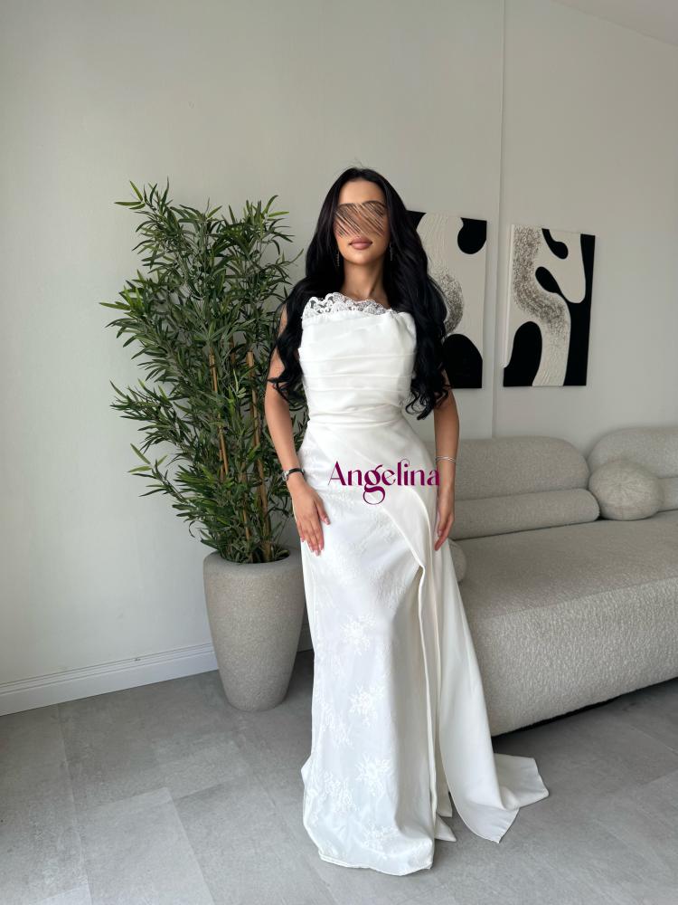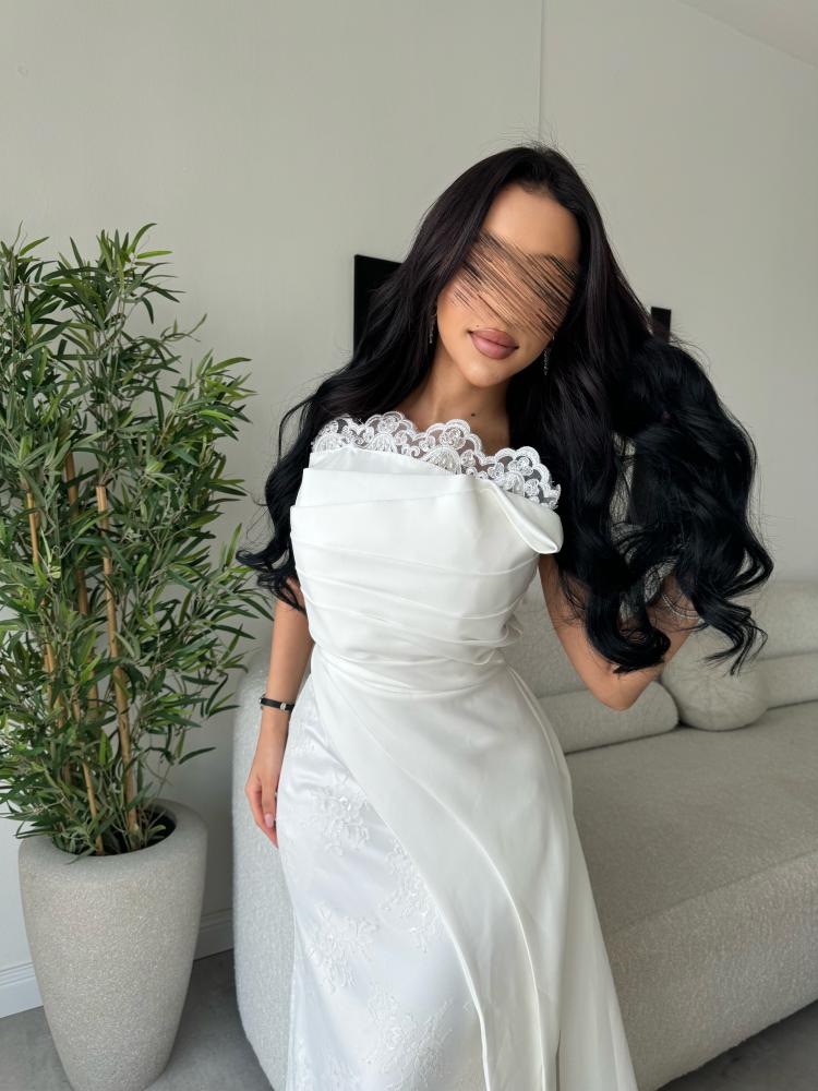 فستان تب طويل ناعم سهرة لون ابيض بقماش التفتة الباربي والدانتيل الناعم