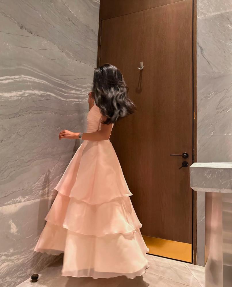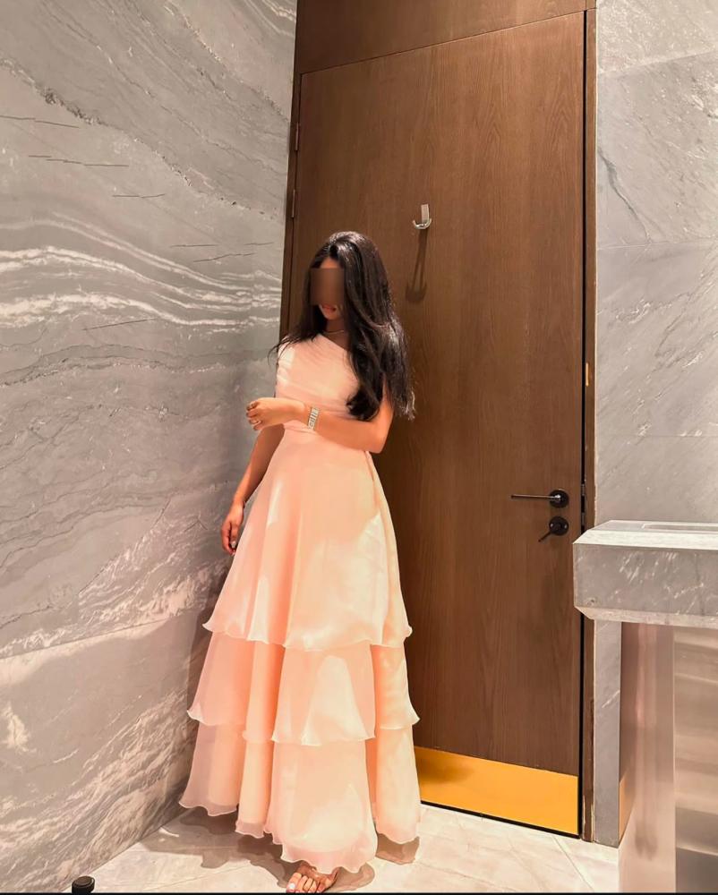 فستان سهرة ناعم طويل طبقات لون لحمي فاتح بقماش الاورقنزا الساده مبطن بتفتة