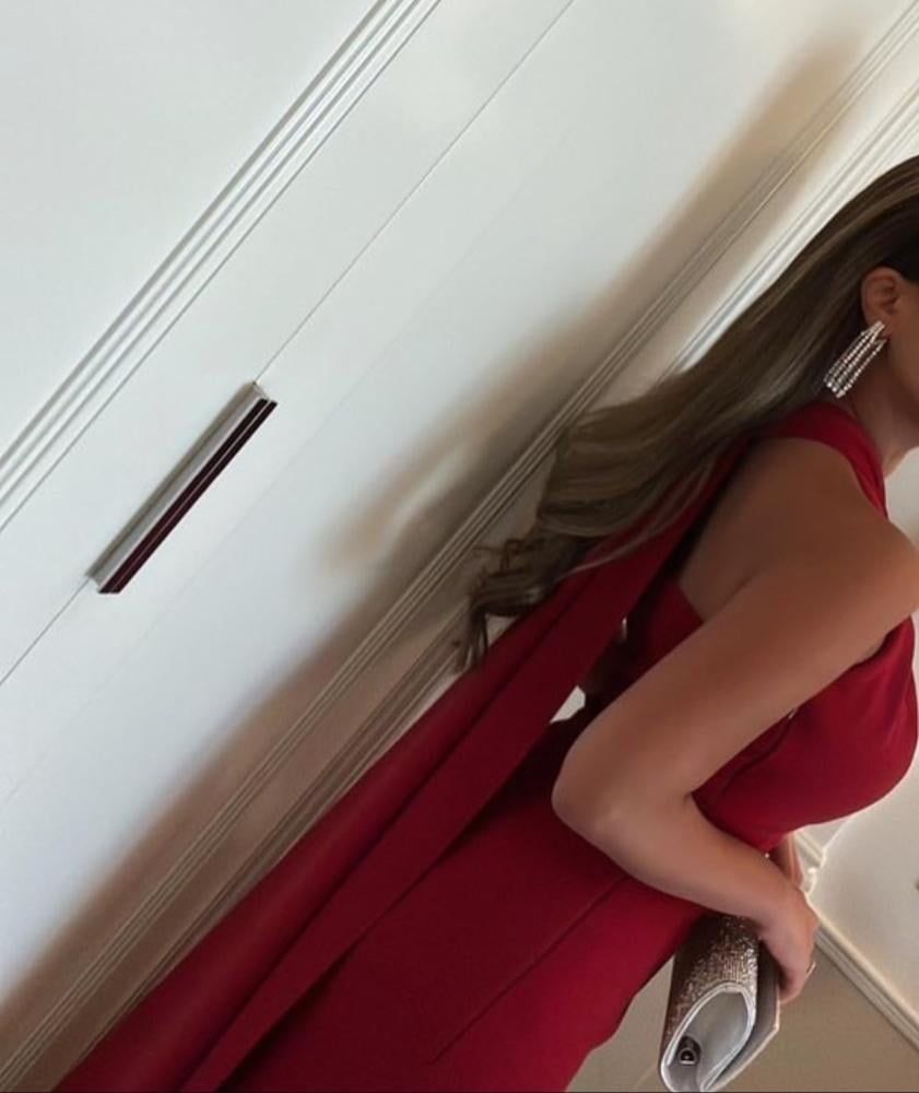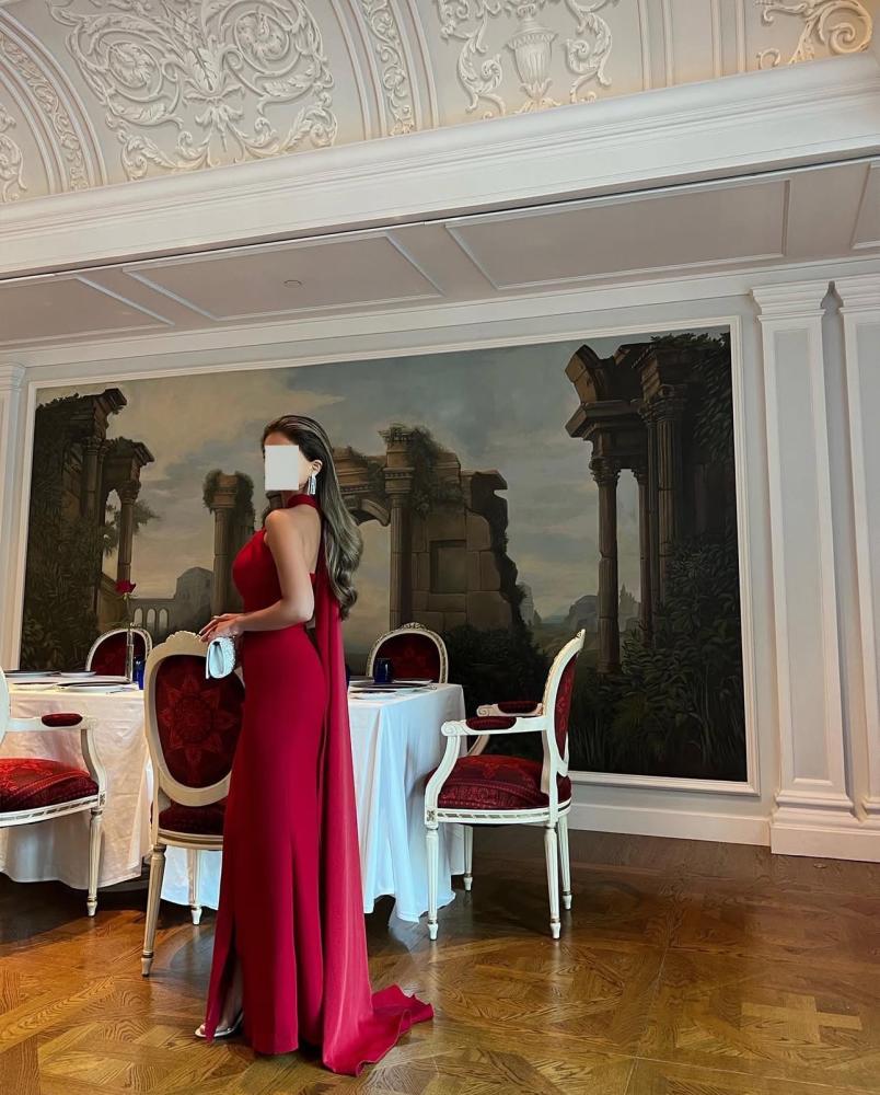 فستان طويل ناعم لون احمر مزين ب اكسسوار وربط بقماش التفتة الباربي
