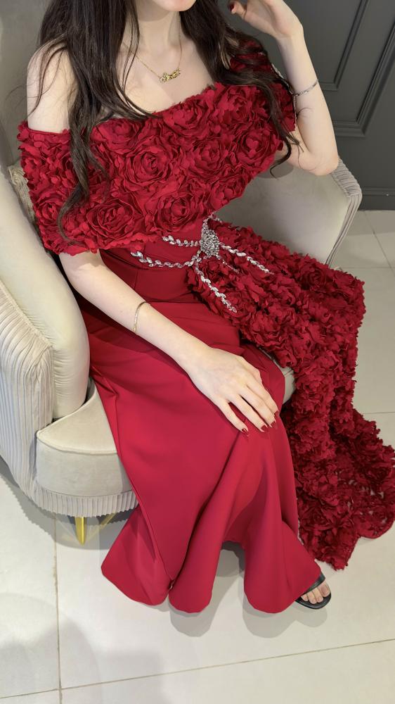 فستان بلون البرغندي بخام الباربي وخام مورد مزين بتطريز راقي بخمسة مقاسات من S الى XXL