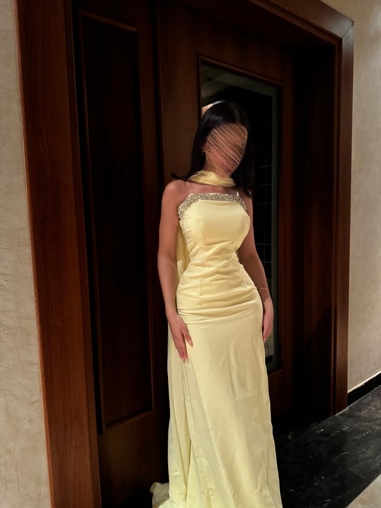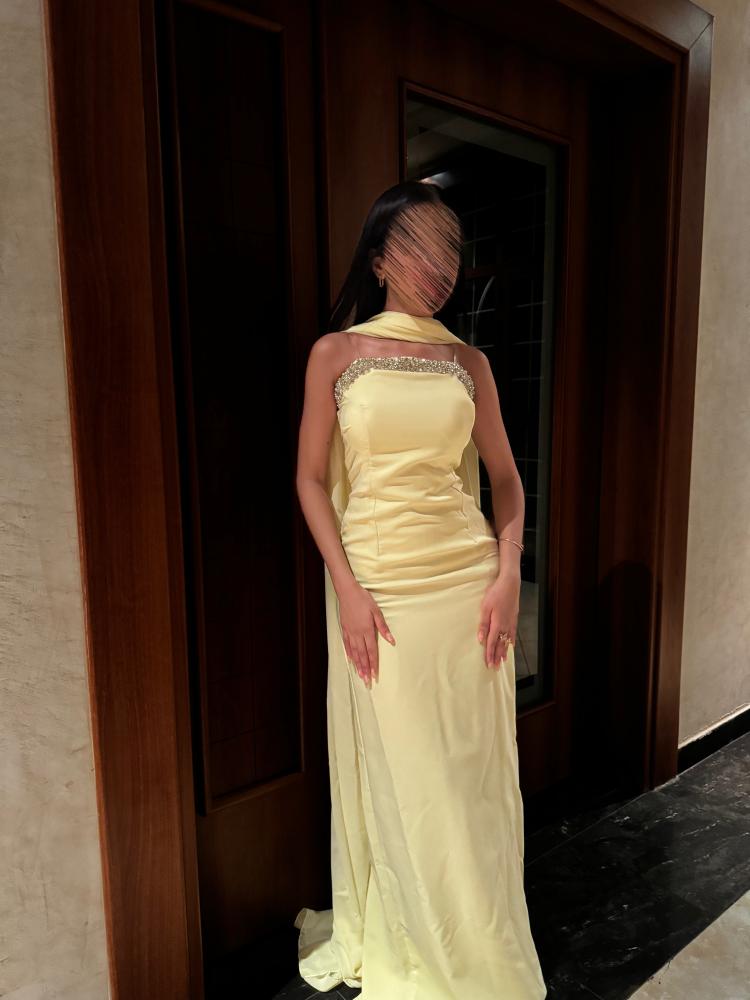 فستان اسيل بلون الليموني بخام الباربي مزين بتطريز كرستال من عند الصدر متوفر بخمسه مقاسات