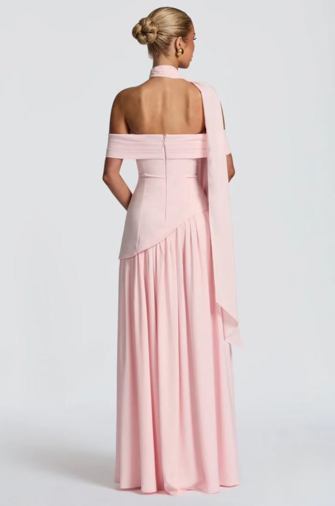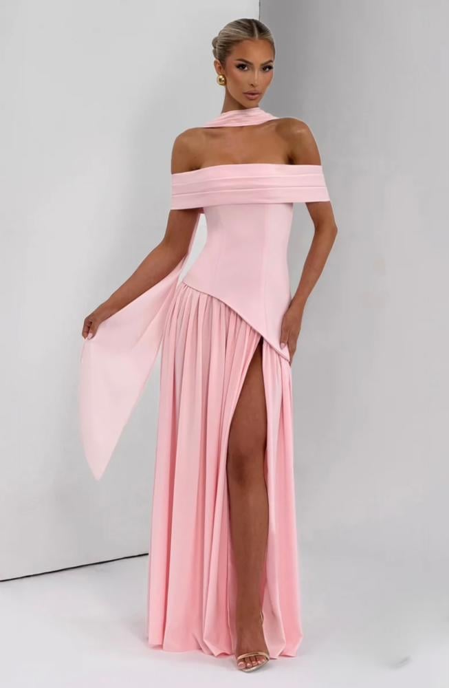 فستان ايناس بخام الباربي مع شيفون بفتحه من الساق بشال على الكتف من خام الشيفون