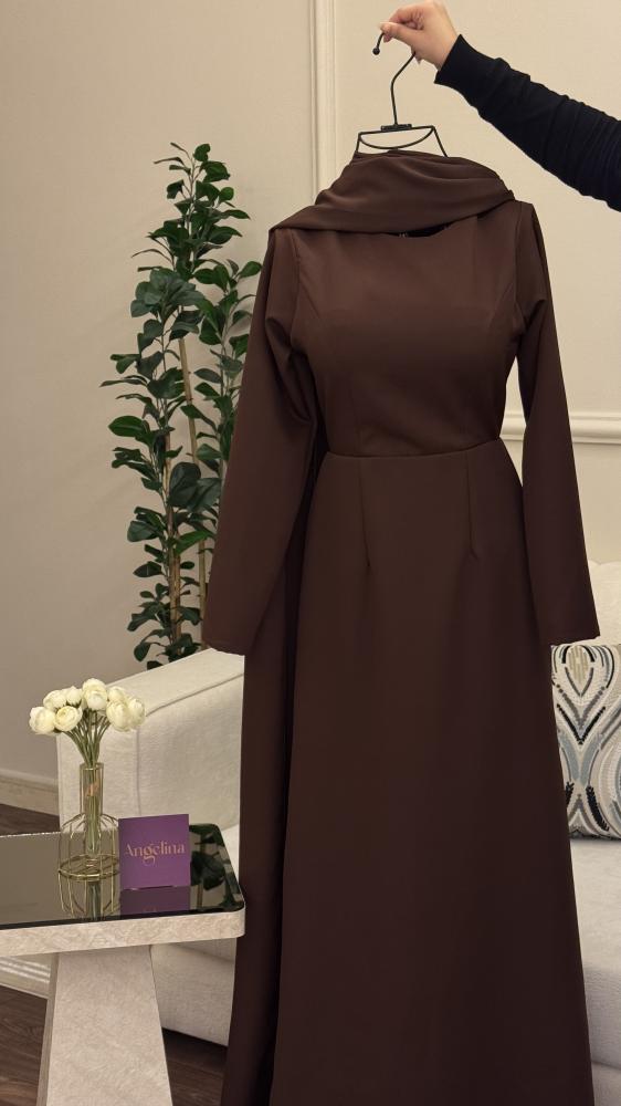 فستان طويل ناعم لون بني بشال واكمام طويله بقماش التفتة الباربي