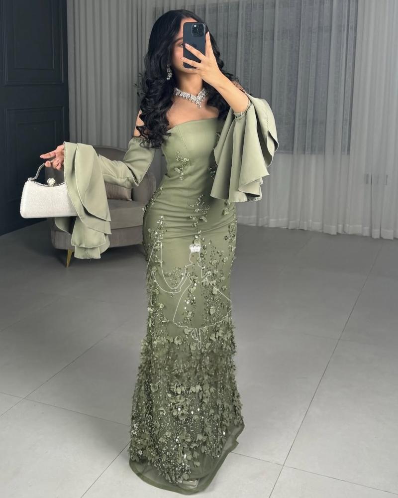 فستان طويل ب اكمام طويله فرنسي قماش سهرة مبطن بخام التفتة واللون الزيتوني