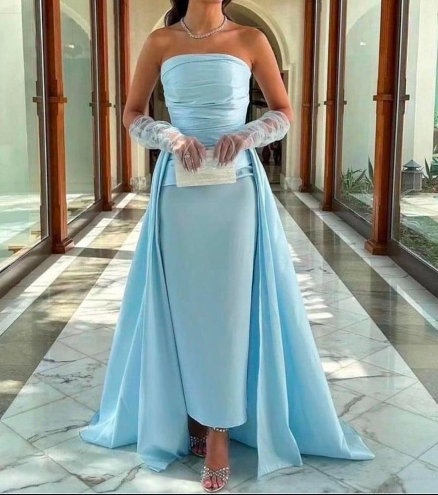 فستان تب سهرة طويل لون سماوي بقماش التفتة الباربي والتفتة الشانطون وب اكمام تل منفصله