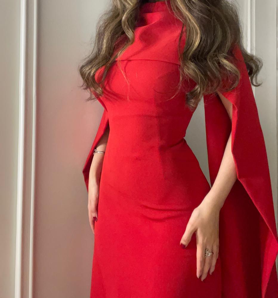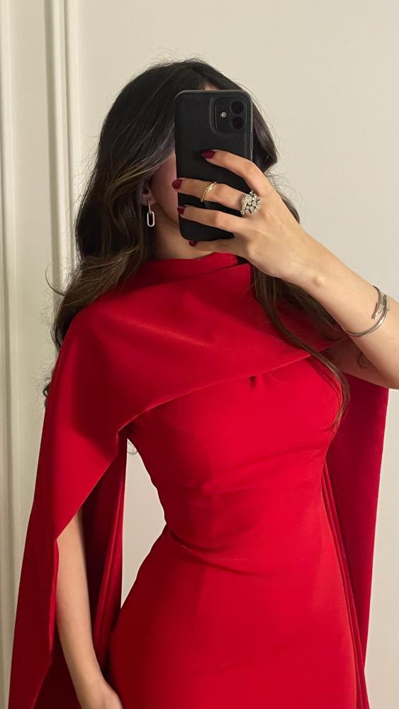 فستان طويل ناعم لون احمر ب شال منفصل بقماش التفتة الباربي