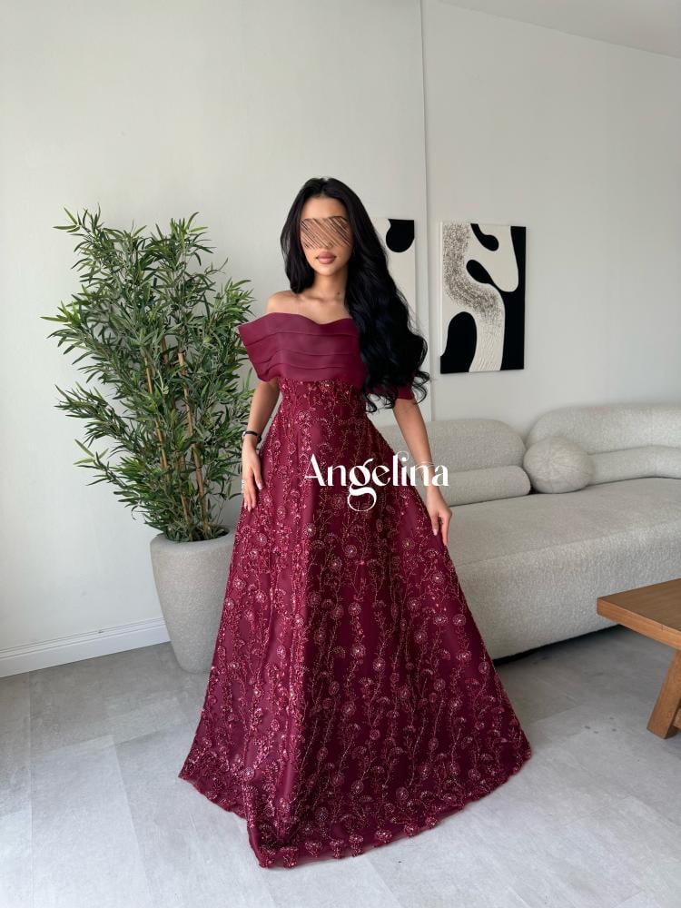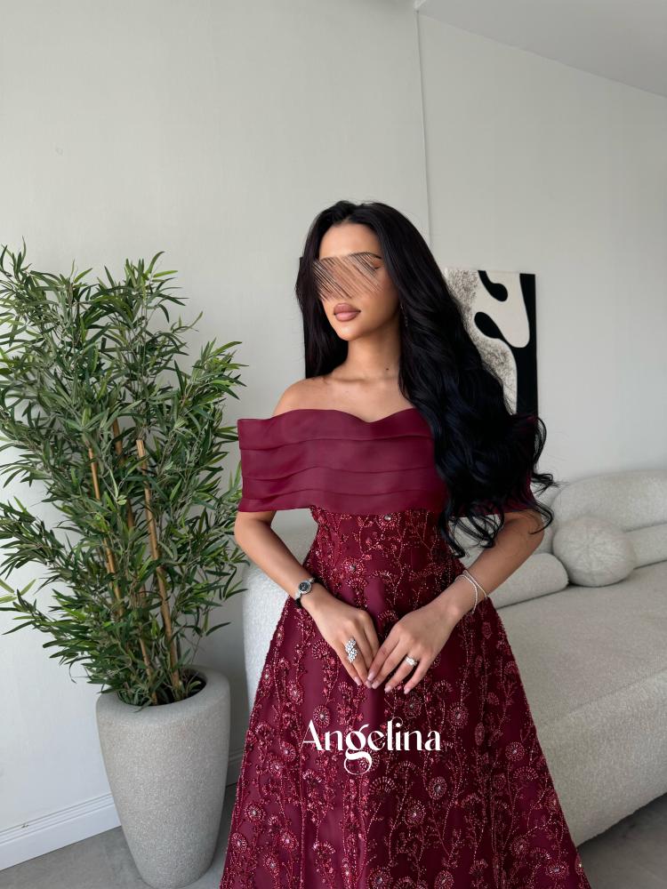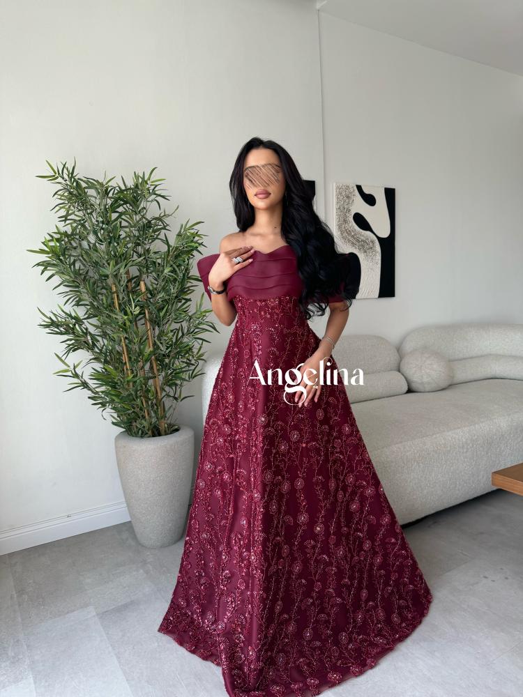 فستان طويل سهرة فخم وراقي لون عودي قماش خرز بالكامل