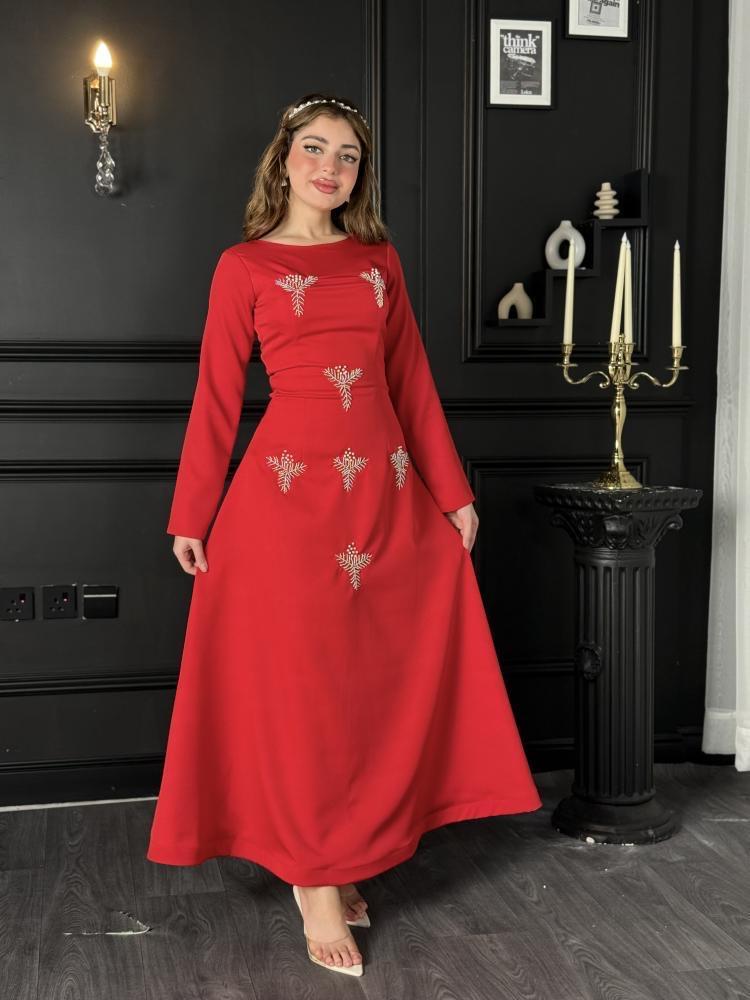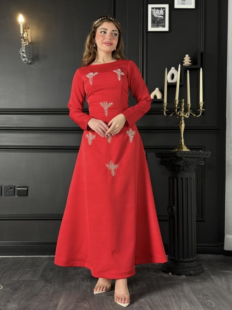 فستان ناعم لون احمر مطرز يدوي خرز كرستال بقماش التفتة الباربي