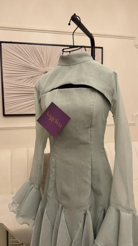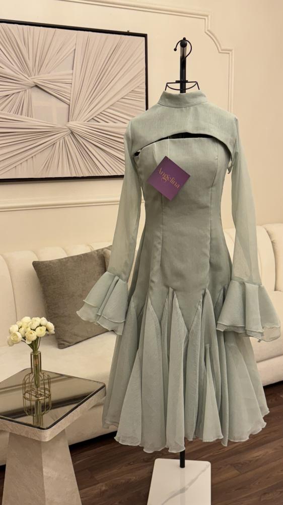 فستان قصير بقطعتين منفصله لون زيتوني وبقماش الجازار الساده