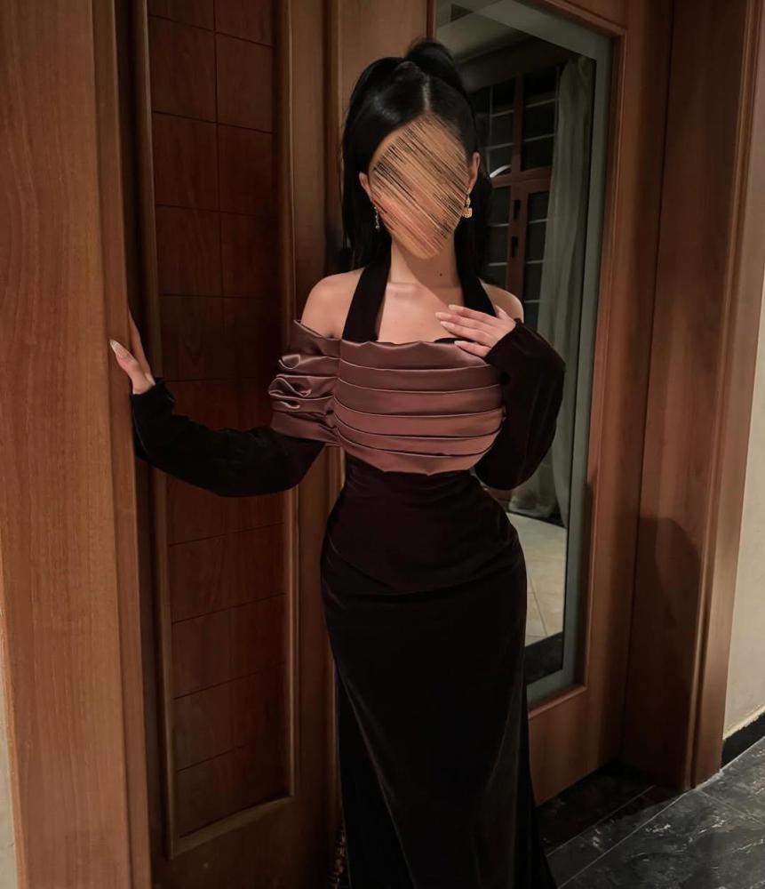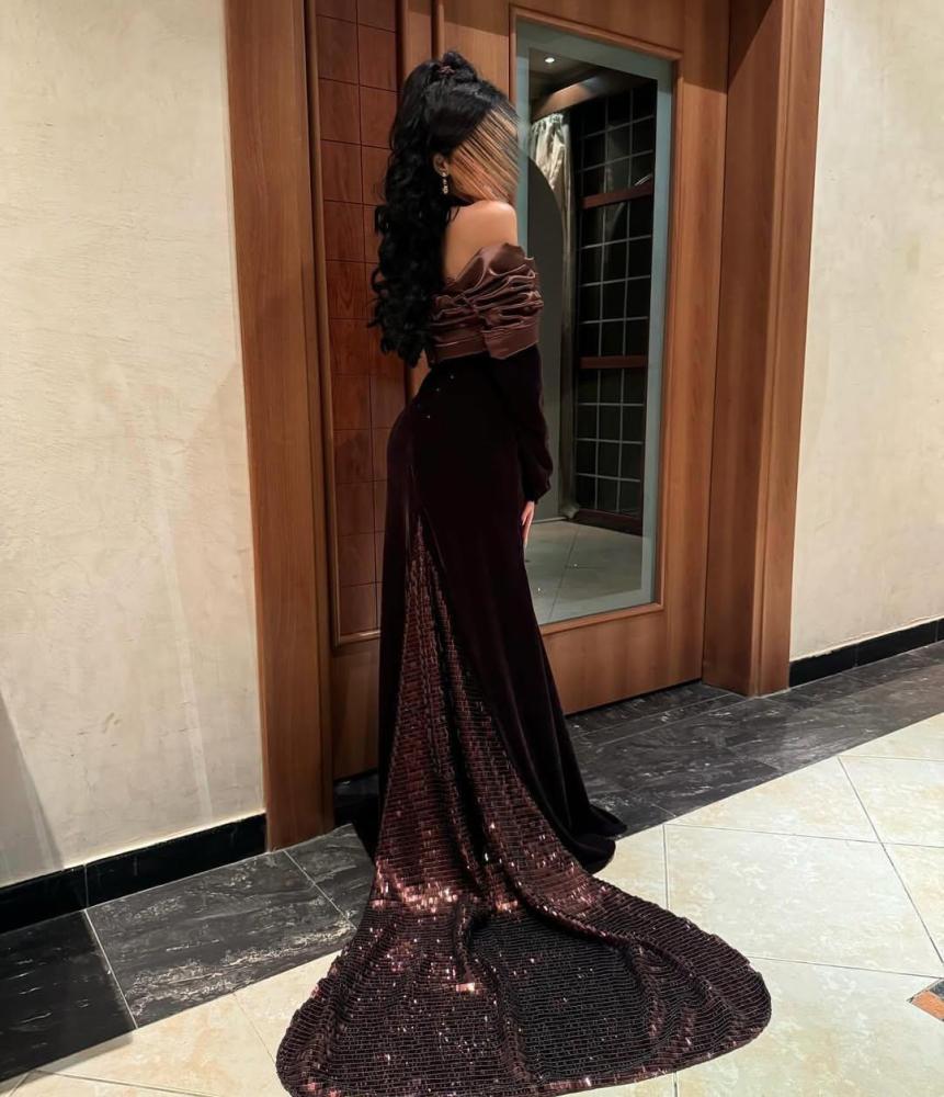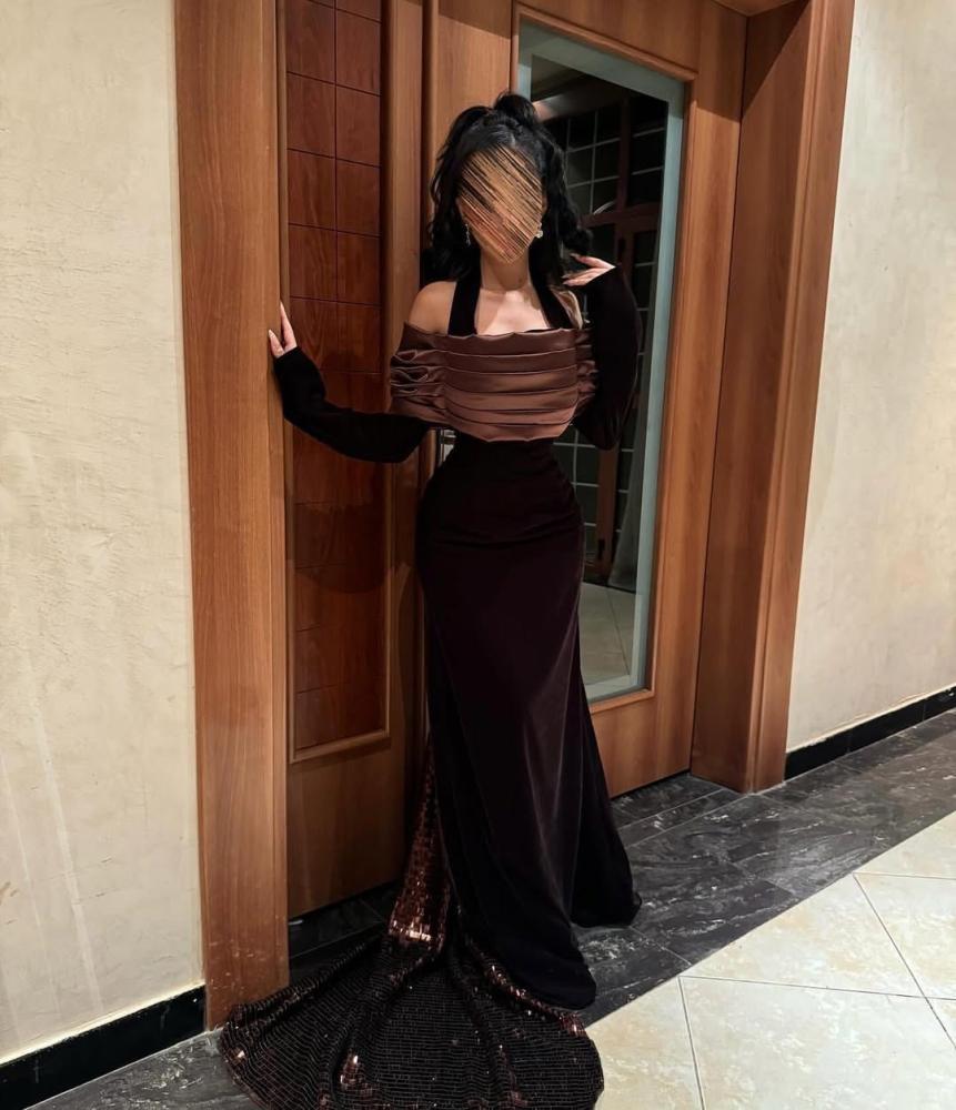 فستان سهرة ناعم طويل لون بني بقماش المخمل الناعم الاسترتش وصدريه بقماش التفتة بإضافة ذيل بقماش الترتر اللماع