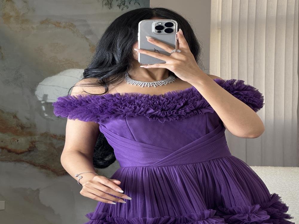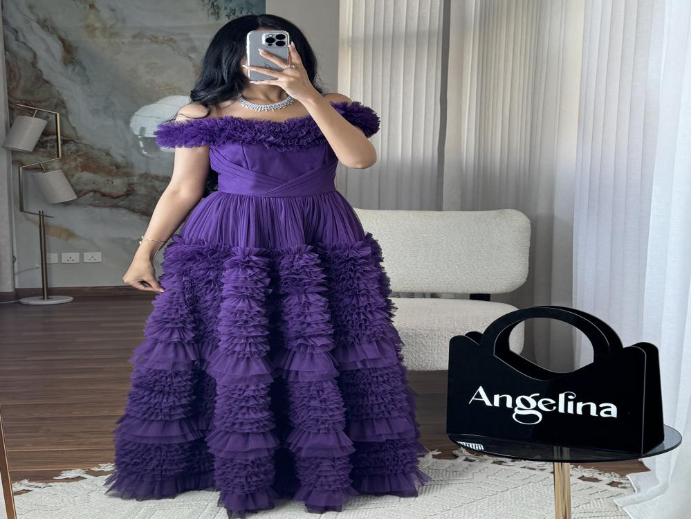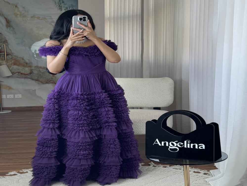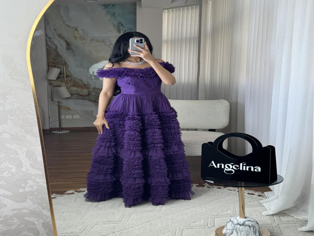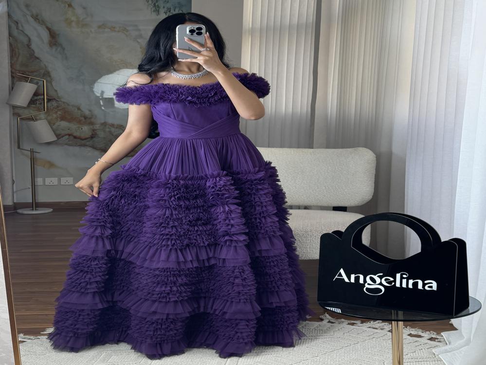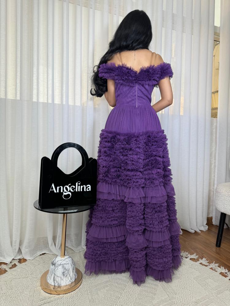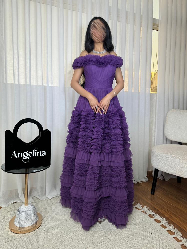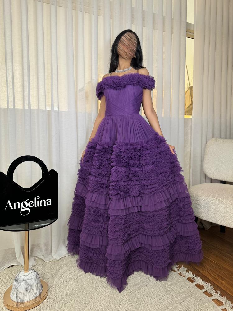 فستان بلون الموف بخام التل بلكامل بخمسة مقاسات من S الى XXL