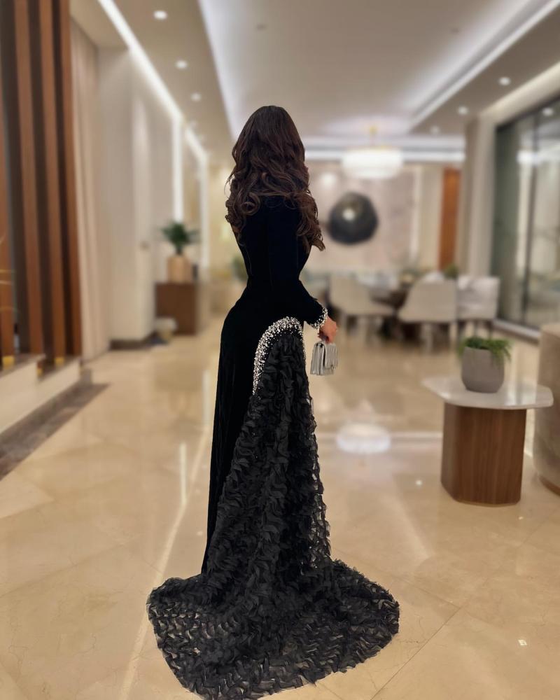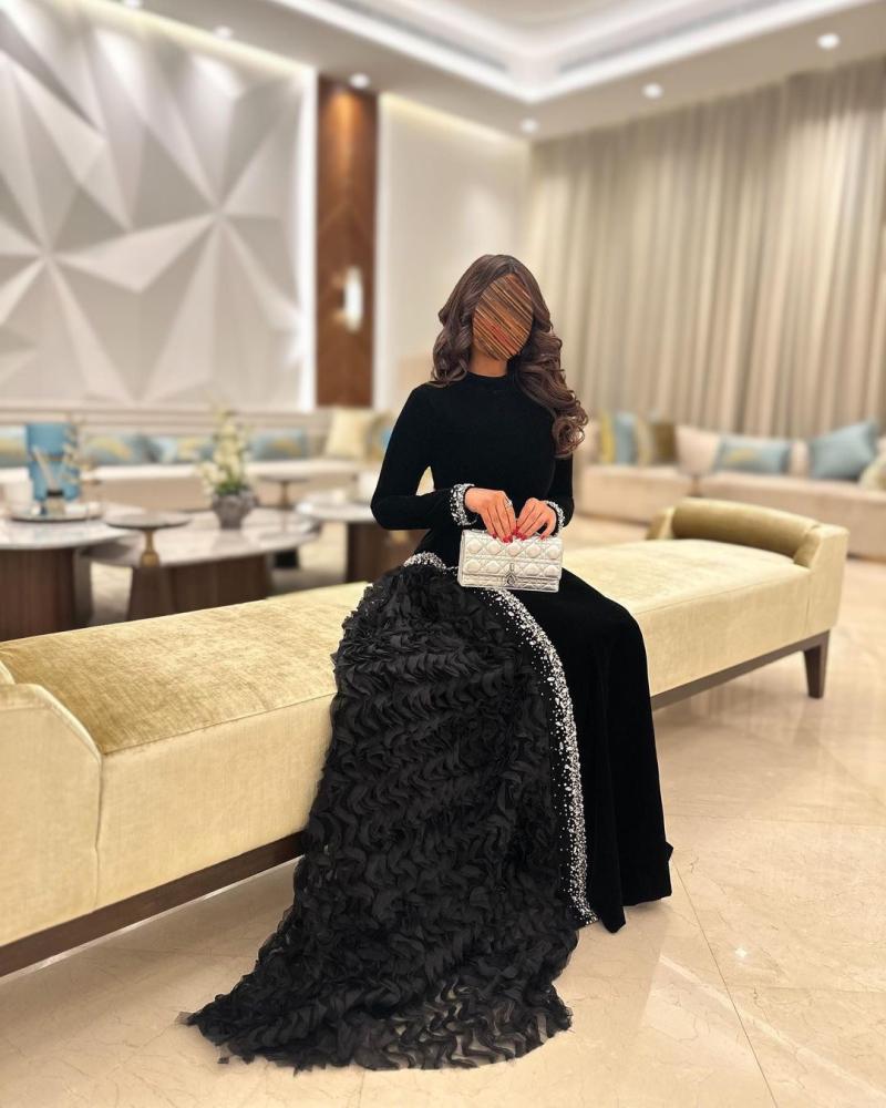 فستان طويل سهرة راقي لون اسود ملكي بقماش مخمل جوخ وجازار مكرنش وتطريز يدوي كرستال