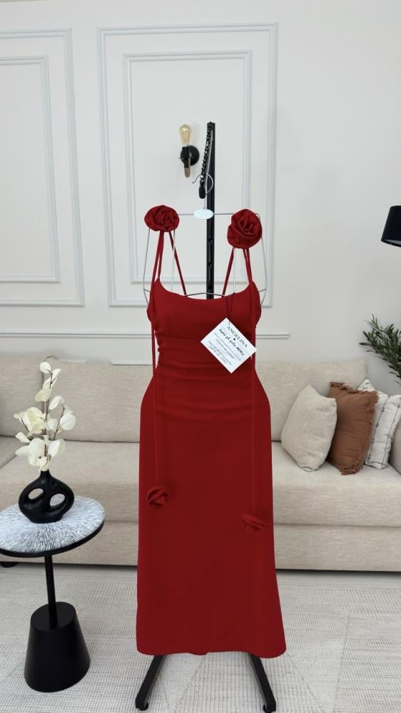 فستان ميد احمر علاقي بخام اللكرا الكريب الاسترتش