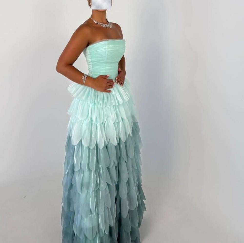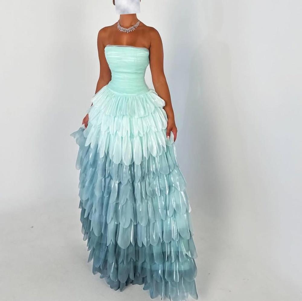 فستان تب سهرة مموج بقماش التل الناعم والاورقنزا ليزر