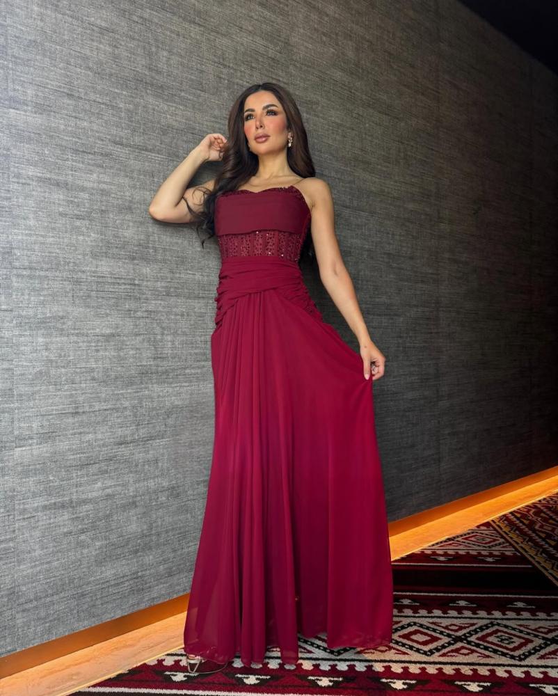 فستان تب طويل سهرة لون عودي مطرز بقماش الشيفون