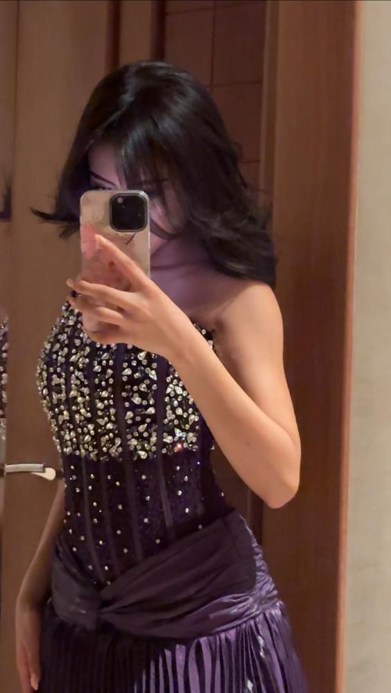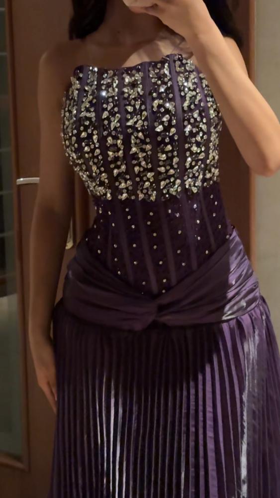 فستان تب سهرة طويل مزين بتطريز خرز يدوي كرستال بقماش التل الشفاف عند الصدر وقماش التفتة البوليسا المكسره