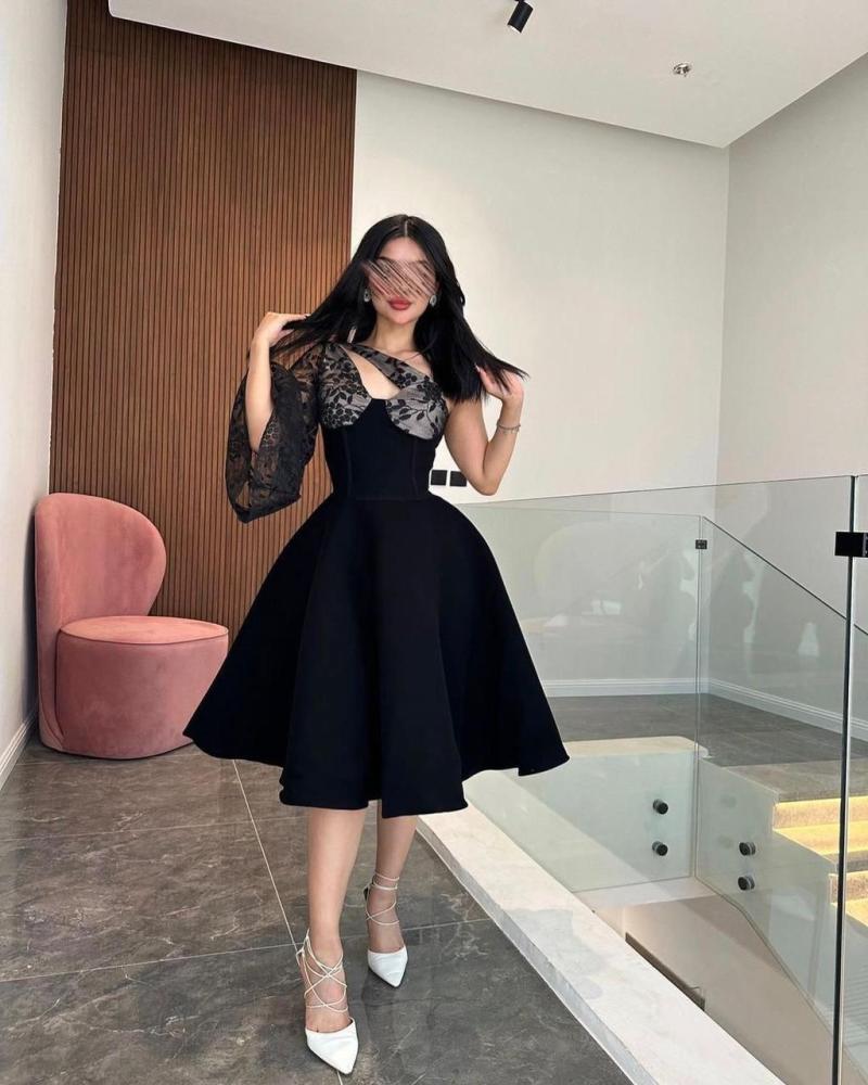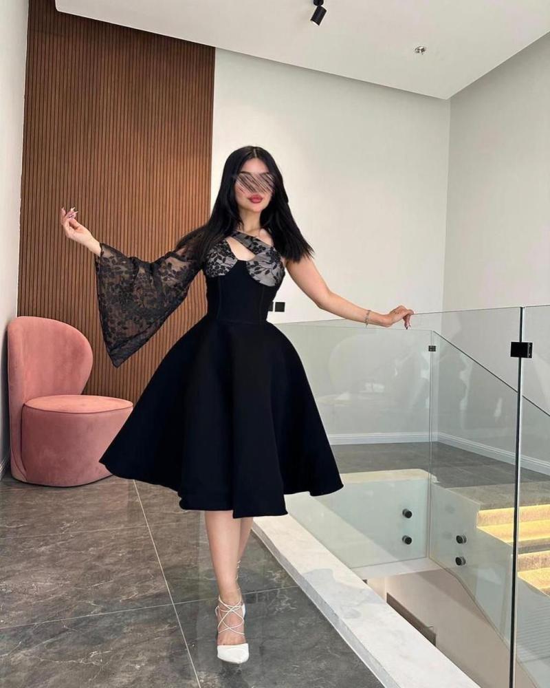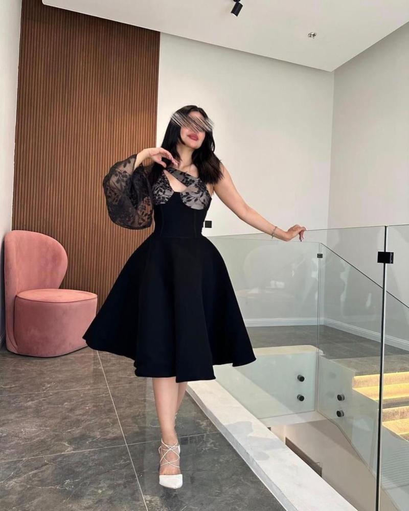 فستان قصير ناعم كم وكم تل سهرة لون اسود بقماش التفتة