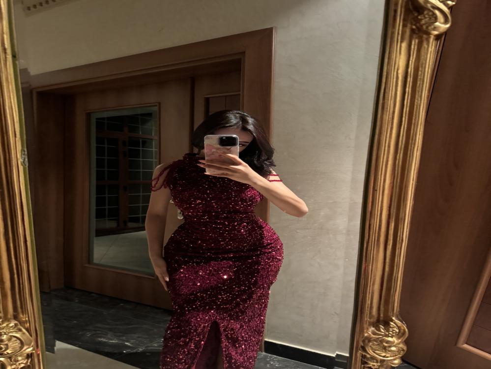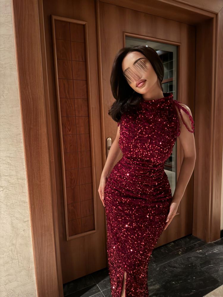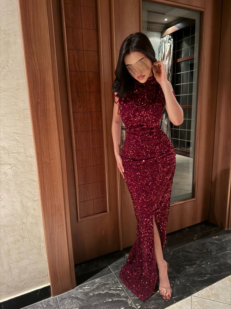 فستان سهرة طويل لون عودي بقماش مخمل ممزوج بالترتر بالكامل مع اضافة كرستال تطريز يدوي عند الاكتاف