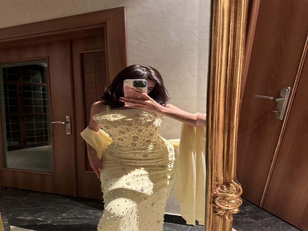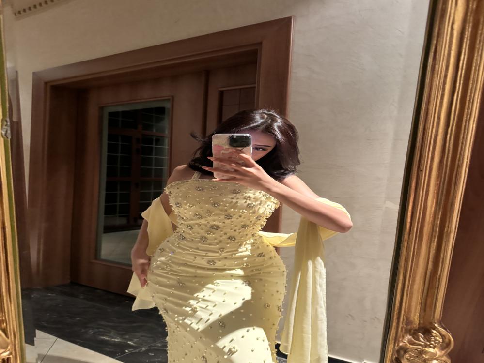 فستان تب طويل سهرة لون اصفر مزين بالكرستال والولو بشال منفصل بقماش التفتة الباربي