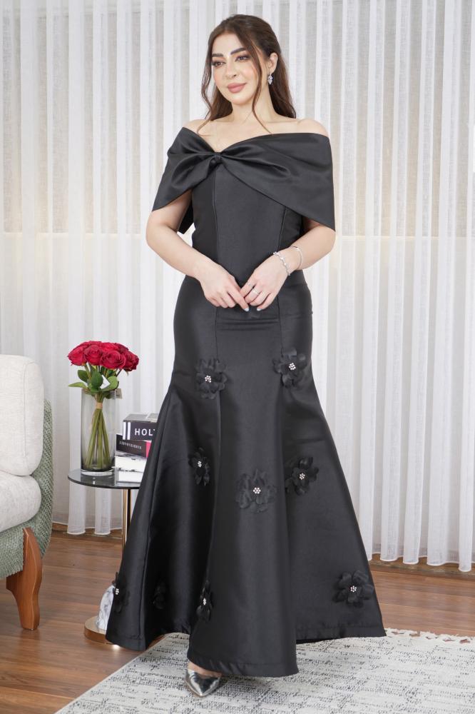 فستان اسود طويل سهرة ورد ليزر بقماش التفتة الميكادو