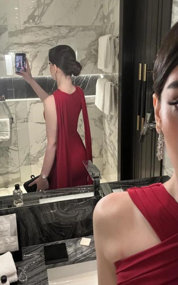 فستان طويل ناعم X عند الررقبه لون احمر بقماش اللكرا الكريب الاسترتش الناعمه