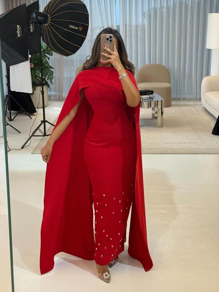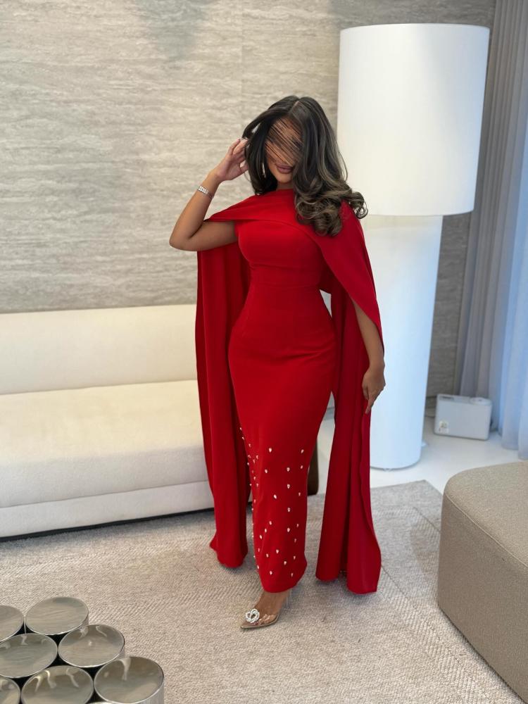 فستان طويل ناعم لون احمر بقماش التفتة الباربي الناعمه ( غير قابله للتمدد) وتطريز يدوي