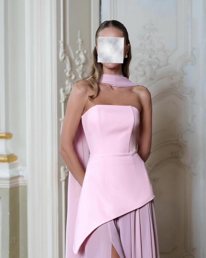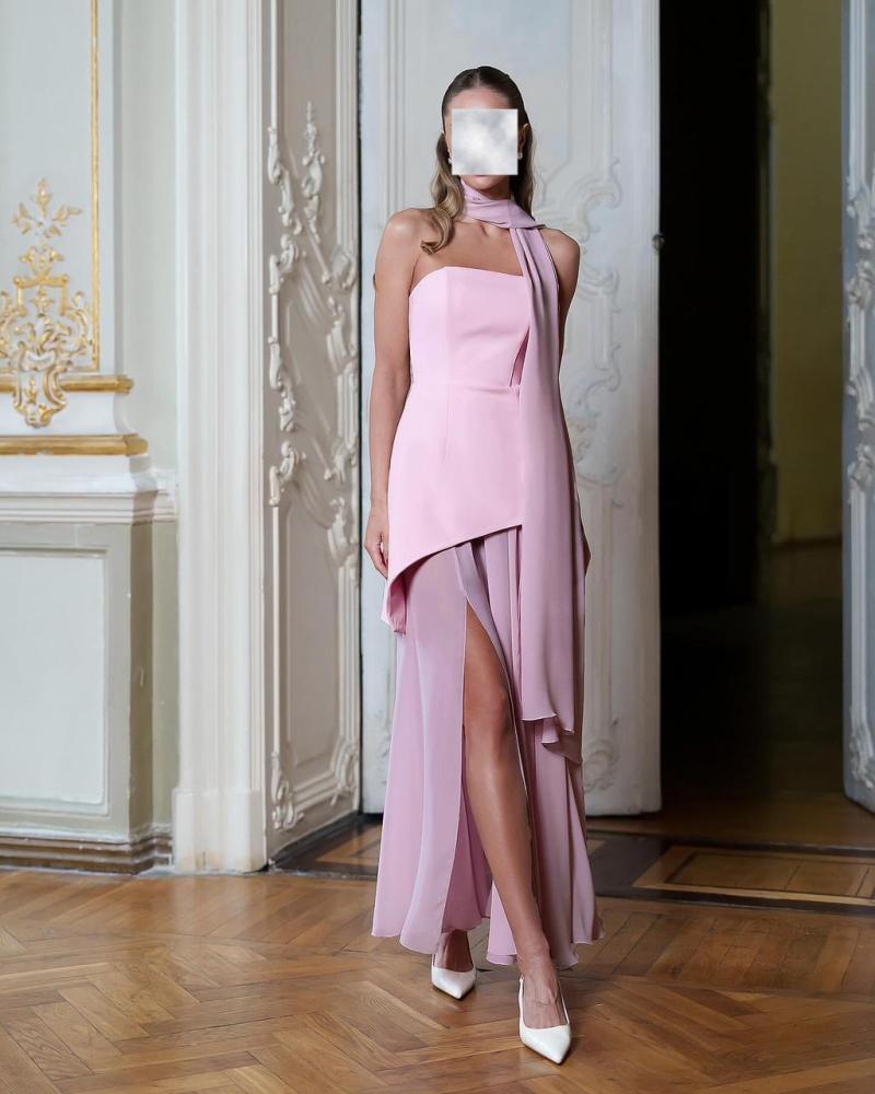 فستان تب طويل ناعم لون لحمي ب شال منفصل بقماش التفتة والشيفون