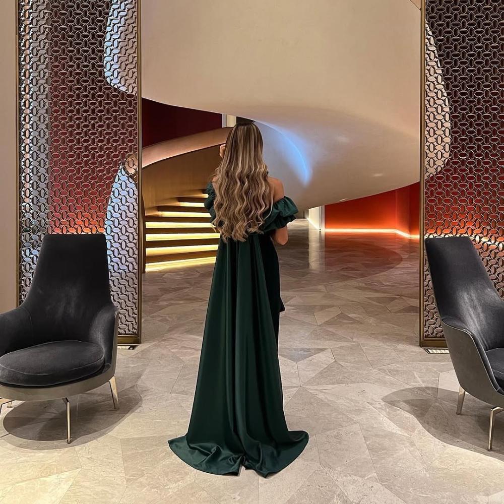 فستان طويل ناعم سهرة لون اخضر ( زيتي ) بقماش اللكرا الكريب الاسترتش والتفتة الساتان