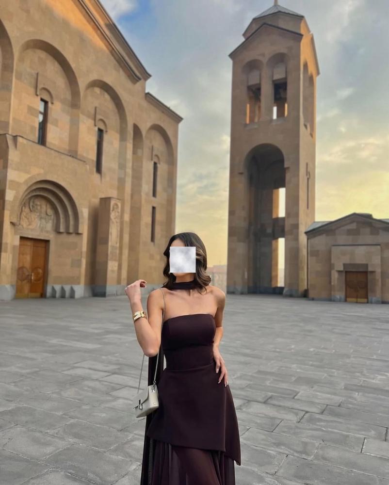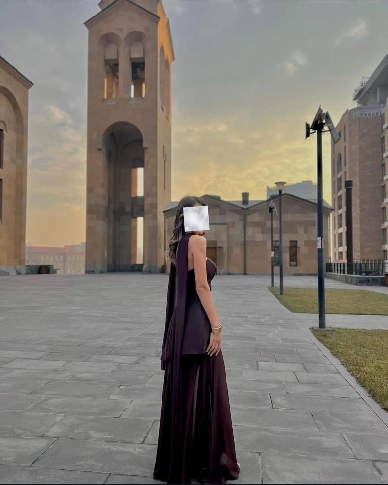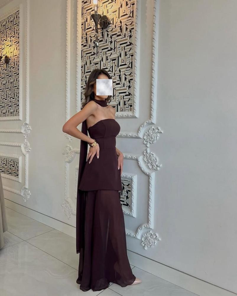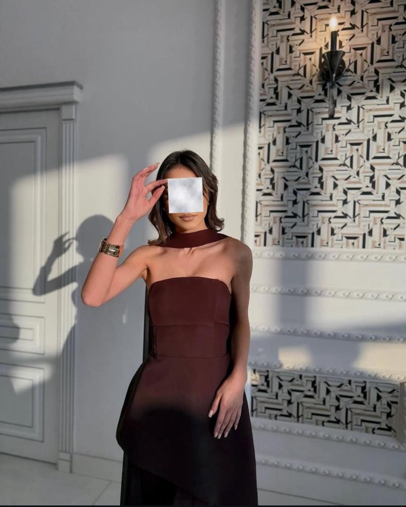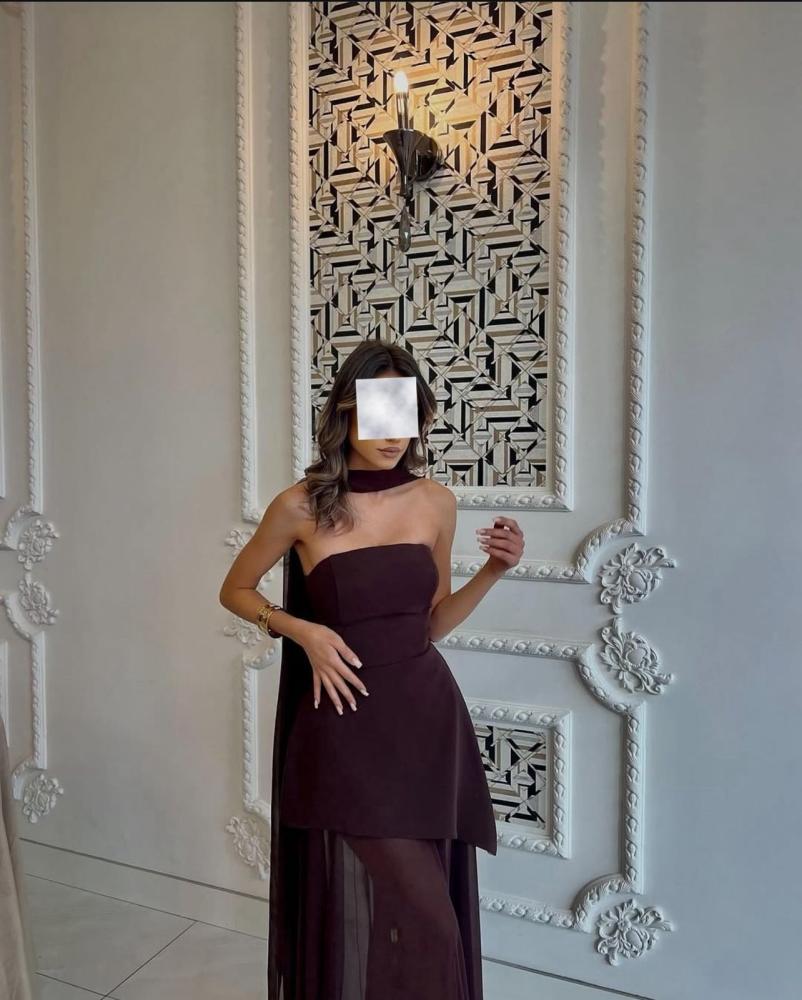 فستان تب طويل ناعم لون موكا بشال منفصل بقماش التفتة الباربي والشيفون