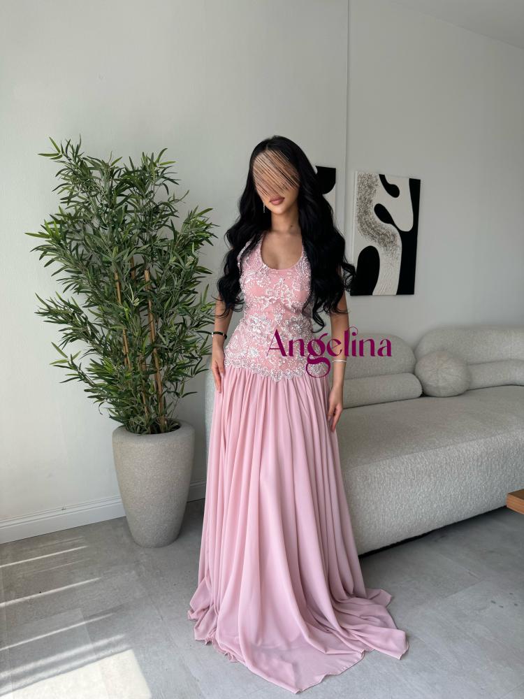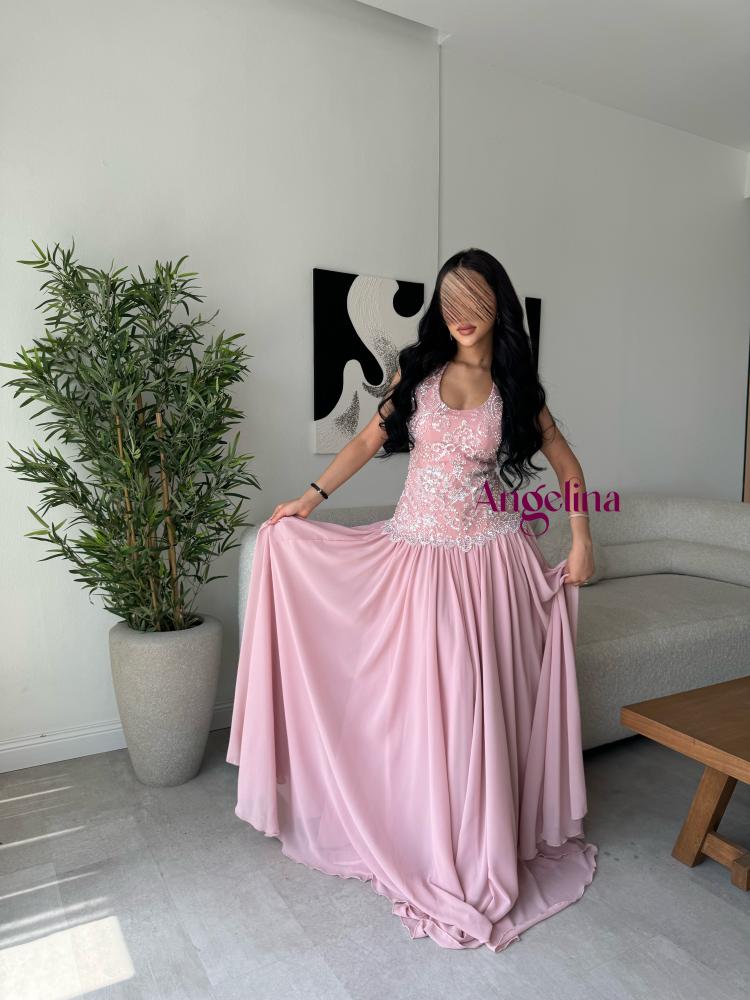 فستان سهرة ناعم طويل رقبه ربط لون لحمي مطرز عند الصدر كلفه خرز يدوي وقماش سفلي شيفون مبطن