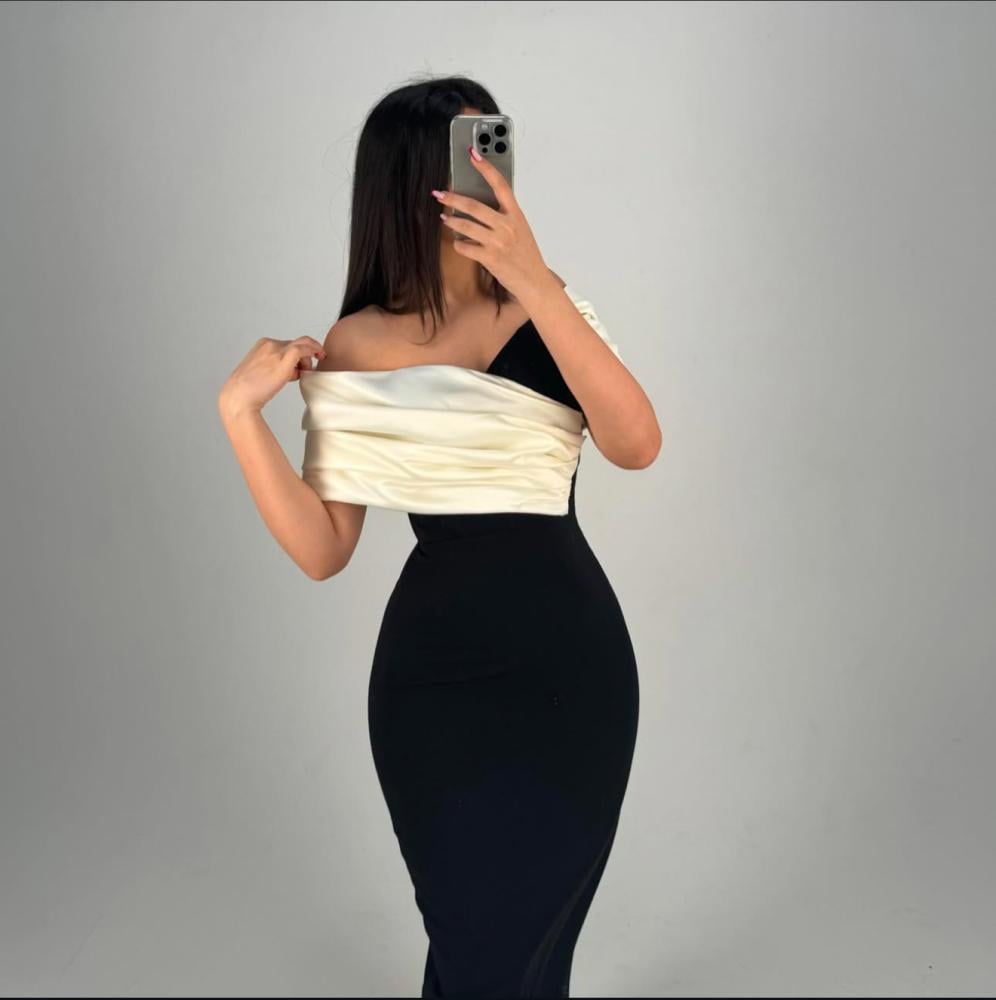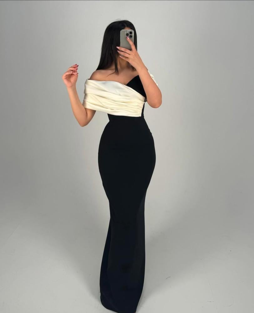فستان طويل ناعم لون اسود وسكري بقماش الكريب الاسترتش والتفته