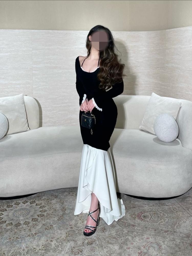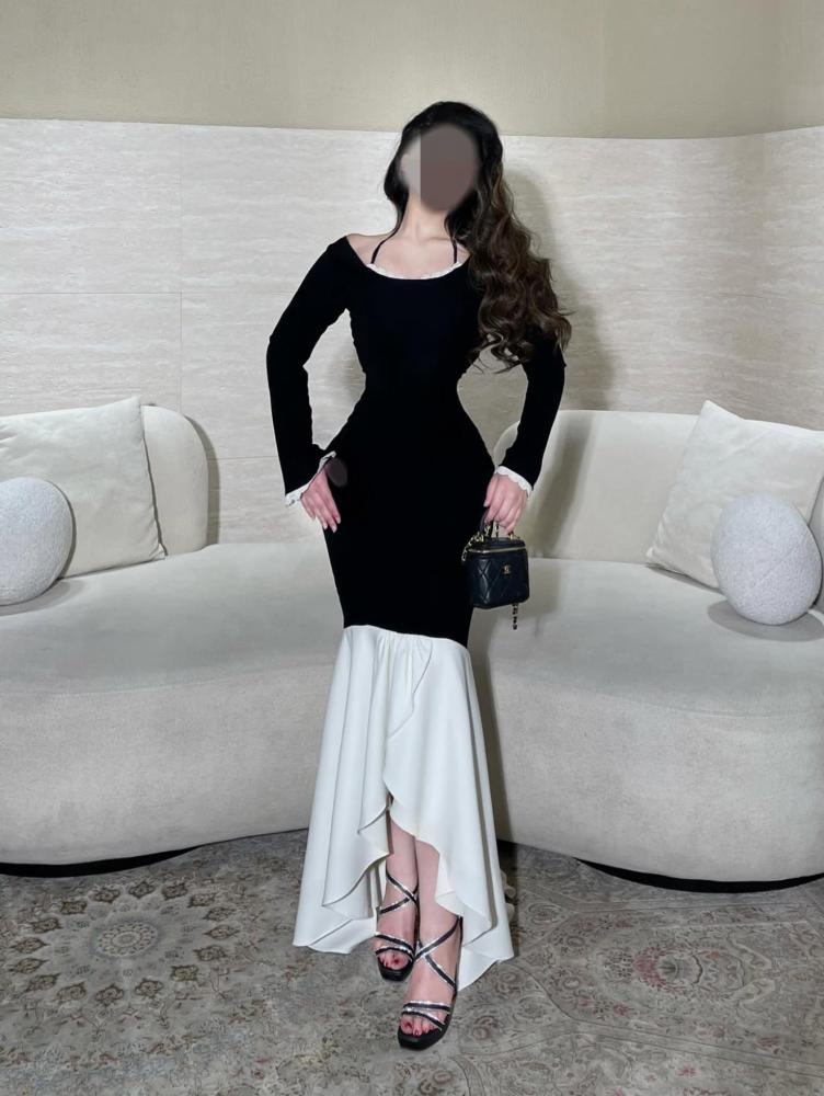 فستان طويل ب اكمام طويله مزينه بكلفه دانتيل لون اسود وابيض بقماش الكريب الاسترتش والتفتة الباربي