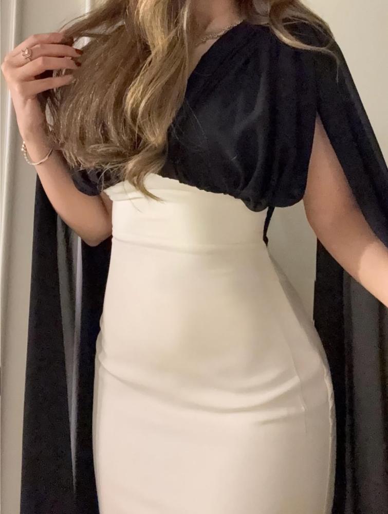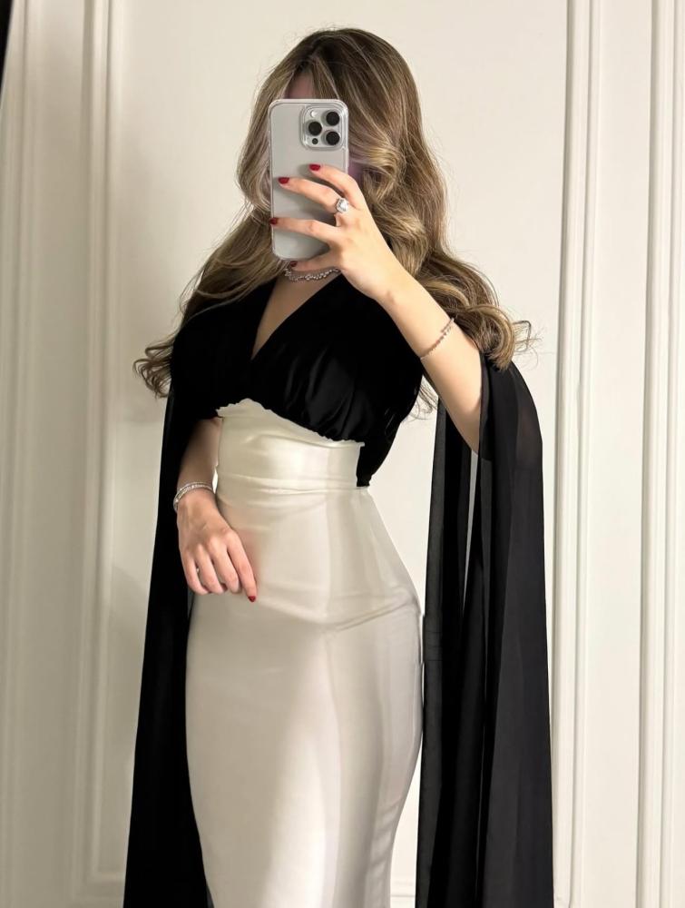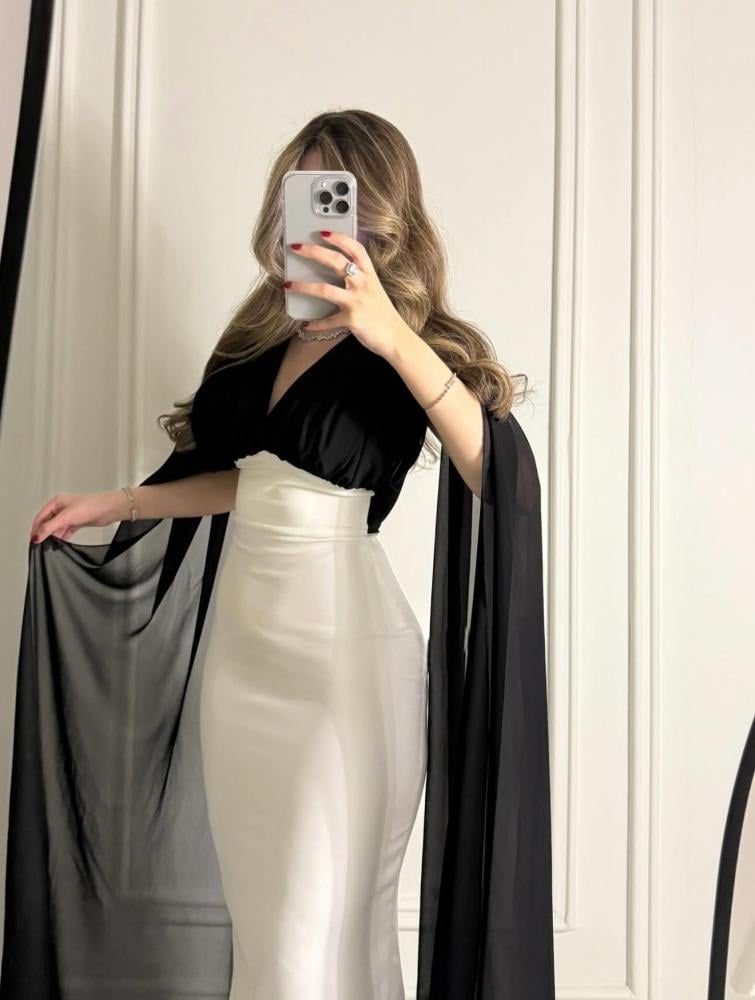 فستان ناعم طويل لون اسود وابيض بقماش التفتة والشيفون
