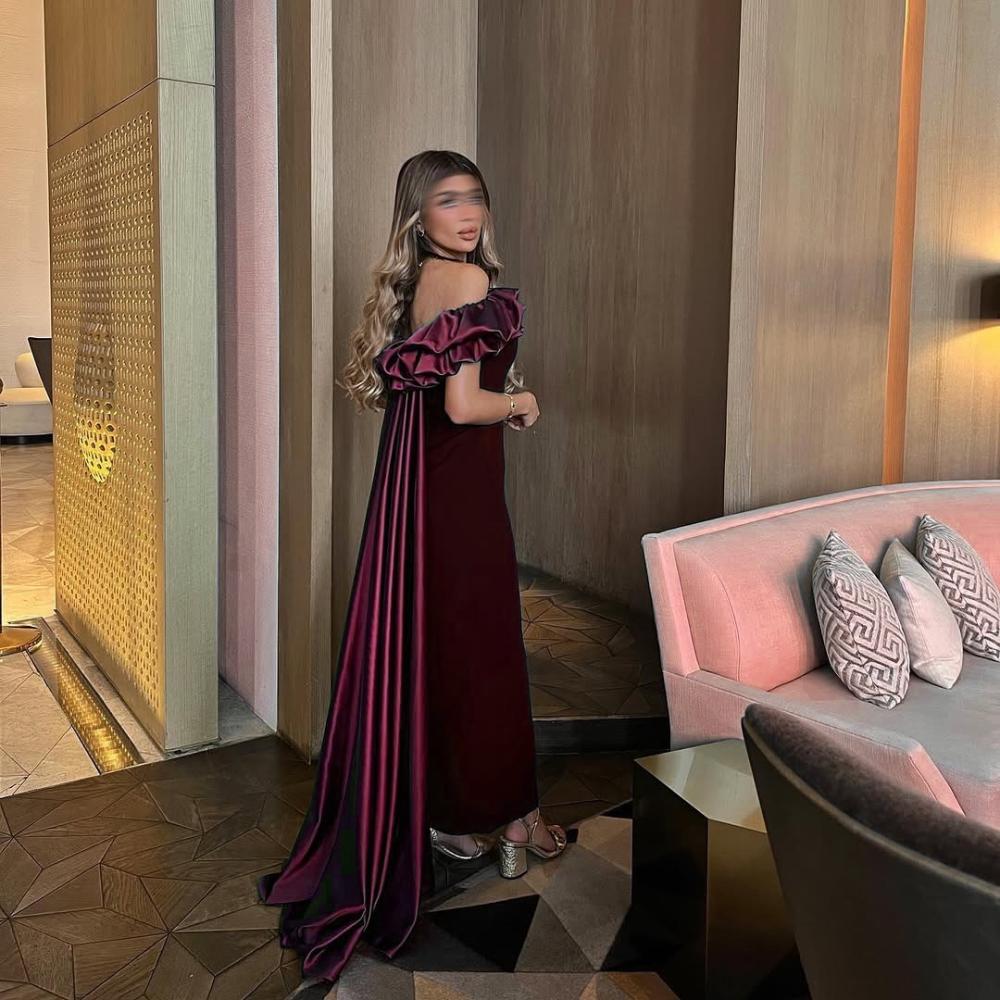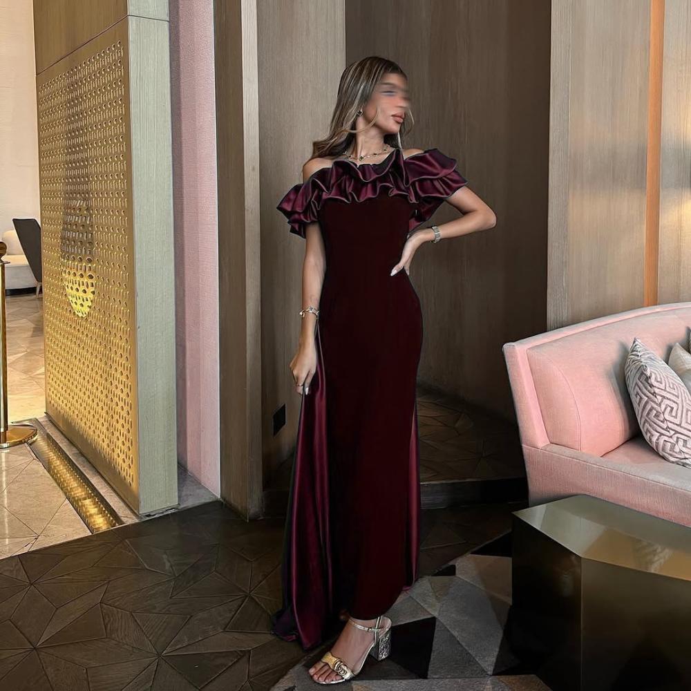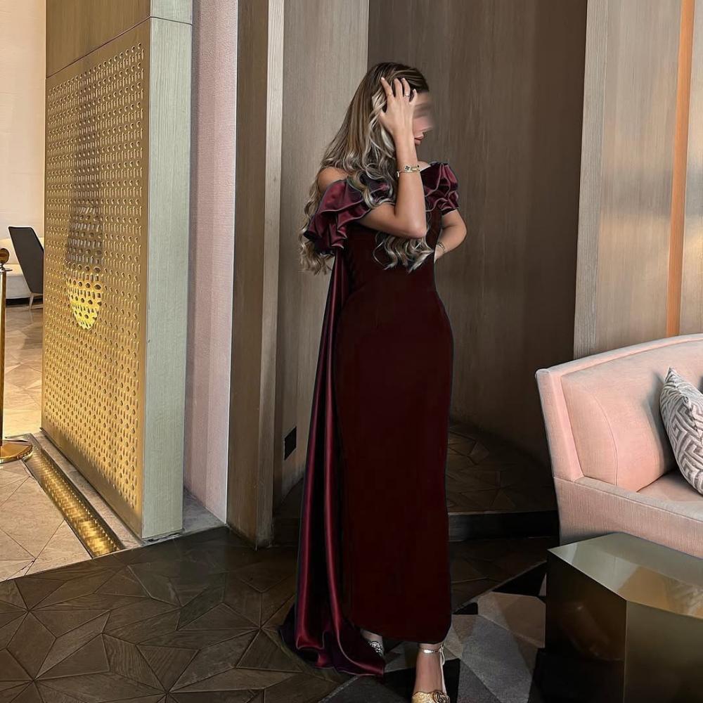 فستان طويل ناعم لون عودي بقماش اللكرا الكريب الاسترتش والتفتة الساتان