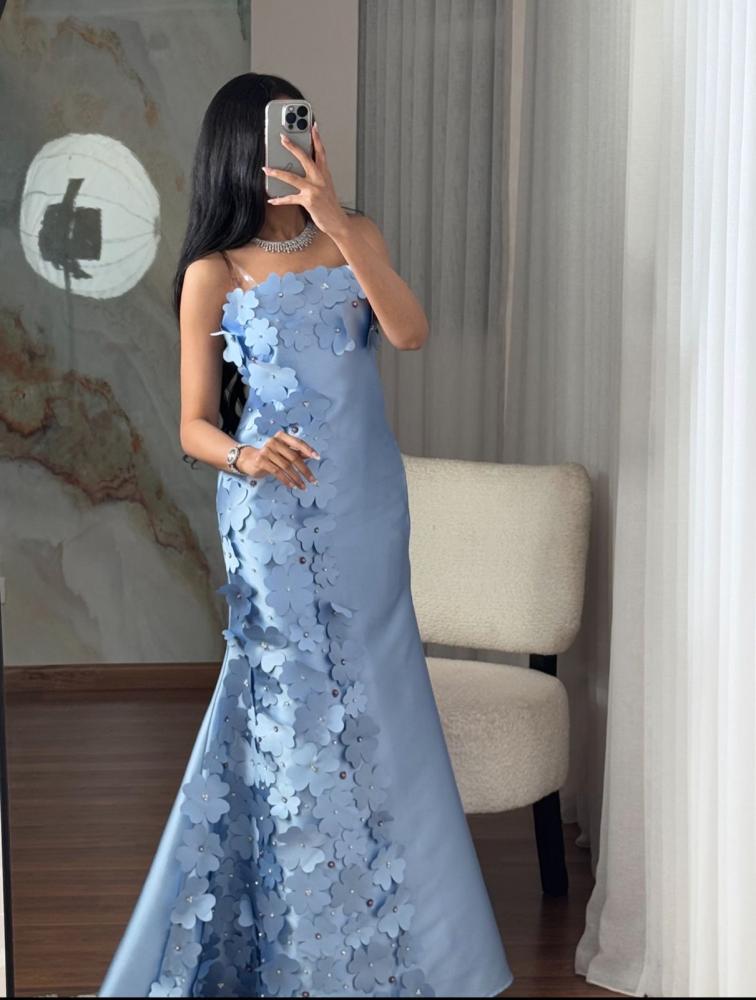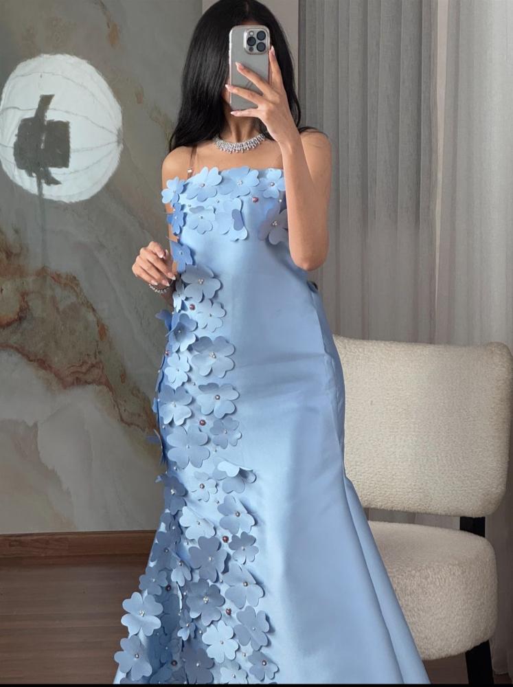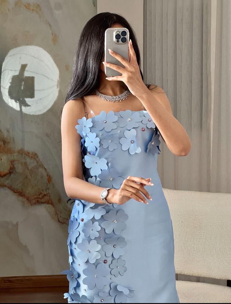 فستان بلون السماوي بخام الميكادو + ورد ليزر من جنب الفستان ب6 مقاسات من S الى XXXL