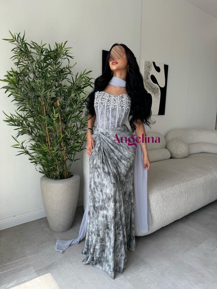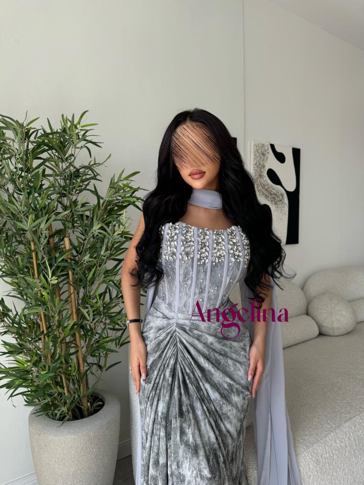 فستان تب طويل سهرة ناعم مموج اللون مضافه الي الون الرصاصي الفاتح بقماش استرتش مطرز عند الصدر تطريز خرز كرستال يدوي وبشال منفصل بقماش الشيفون