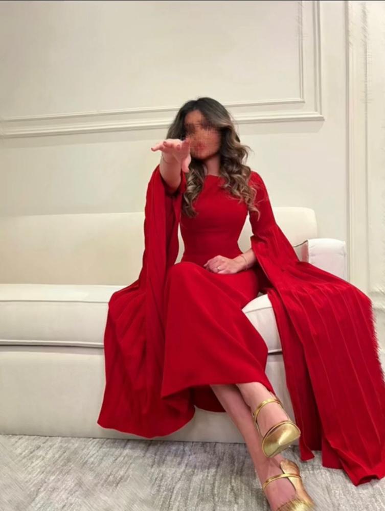 فستان احمر ناعم ب اكمام طويله مكسره بوليسا بقماش اللكرا الكريب الاسترتش